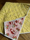 Handmade Babygirl Quilt Crib Daisies Strawberry Jam Summertime White Trim. This quilt was made by me :) All supplies purchased from JoAnn Fabrics. All fabrics prewashed. Top is cotton fabric with embroidered daisies. The backing is flannel gingham. The trim is hand stitched. Clean smell. Smoke free home. Please feel free to ask any questions. This is a handmade item so imperfections will exist. H01