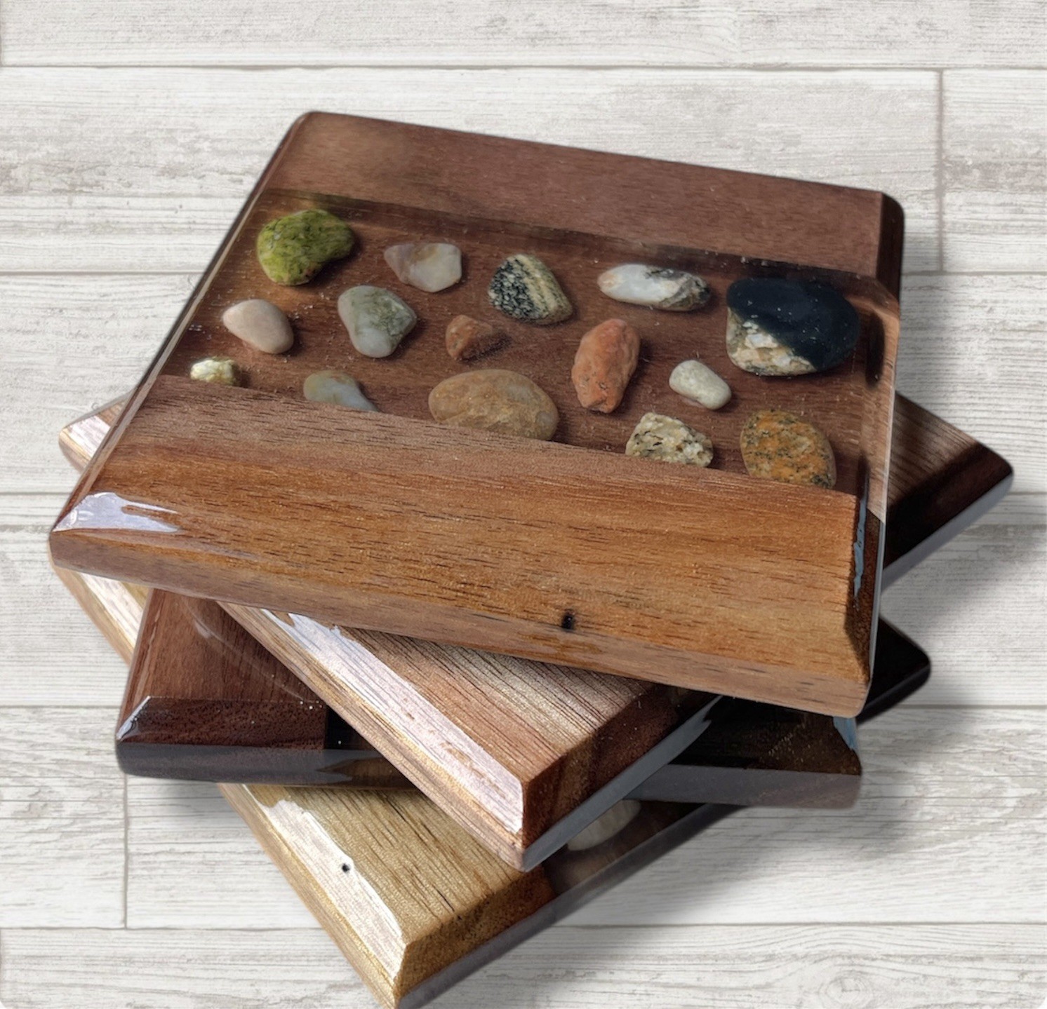 Handmade black walnut wood epoxy resin coasters inlaid with Lake Superior stones that we handpicked ourselves! Sold as sets of 4!