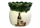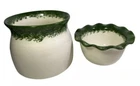 This is a handmade ceramic wine chiller or dip cooler. The round-shaped chiller is designed with an ivory and green color pattern, and it features an impressed backstamp. It is made of ceramic and finished with a glaze. The chiller is dishwasher and microwave safe, and it weighs 3.5 lbs. The set includes two pieces, and it is part of a handmade product line. It is suitable for contemporary wine serving and is produced using art pottery techniques in the United States.