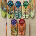 Here's my artistic interpretation of the 2024 Brood XIX Cicada arrival. These were inspired by the stage of first coming out of their shell! Idk what it is about cicadas besides them being beautiful, calm little creatures that sing their song. When I was a kid I'd hear their chirping sound but it was quite a while until I actually saw one up close and how they left their shell behind always fascinated me. A few years back I just started taking pictures of the ones in my yard and made some drawings and paintings of them. I love them. I decided to immortalize my interpretation of their beauty with various colors. I think the wood keeps them in their natural elements while being a source of positivity in art form on your wall. These Cicada wood pieces are hand/jigsaw cut, and painted with Nova color fine acrylic paints. I then sealed them with epoxy resin to last a lifetime.