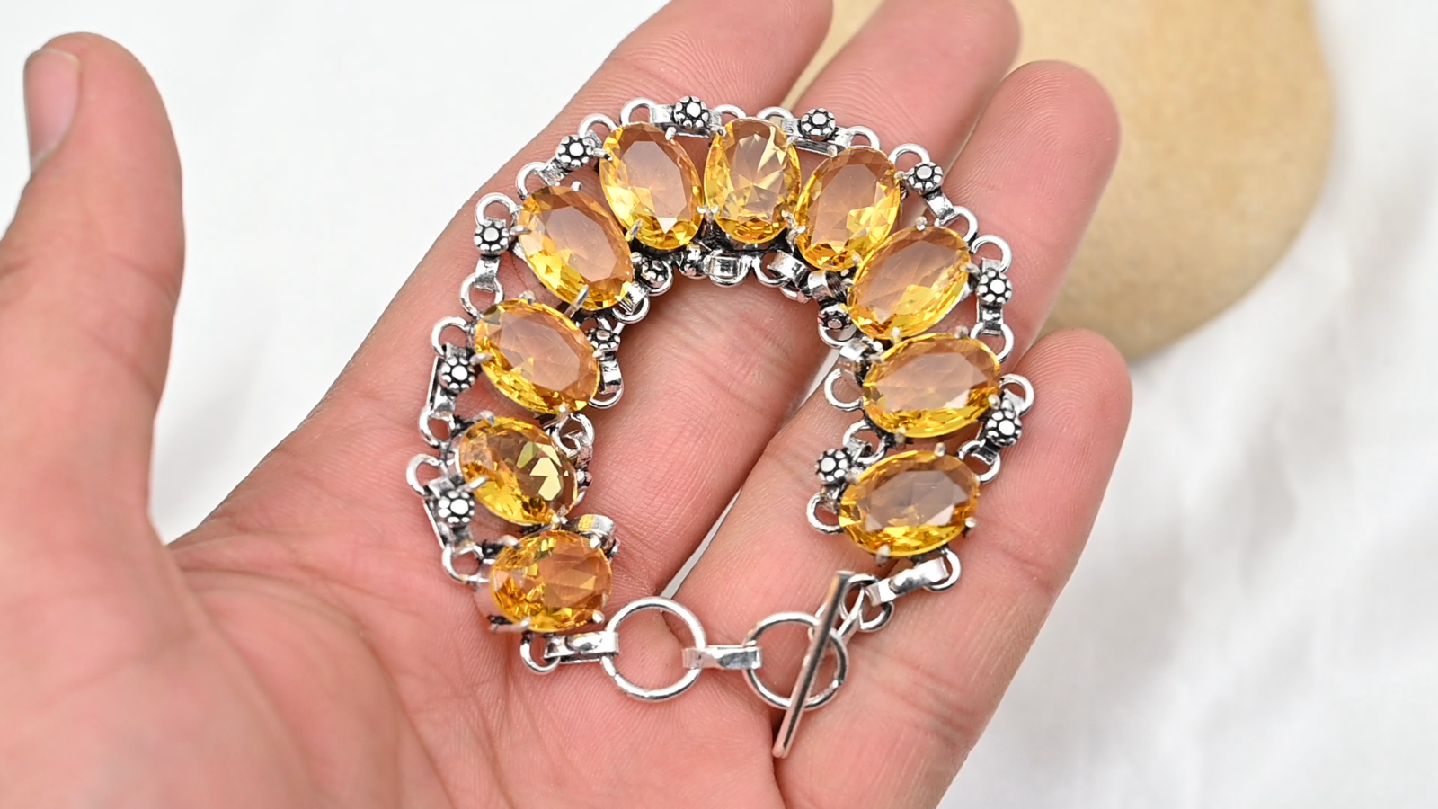 Base Metal:Sterling SilverType:BraceletMain Stone Shape:OvalDiamond Clarity Grade:N/ACountry/Region of Manufacture:IndiaCertification:N/AMain Stone Treatment:Not EnhancedTotal Carat Weight:10 carat and aboveStyle:ChainCountry of Origin:IndiaItem Length:8 inches with Adjustable ChainMaterial:GemstoneMain Stone:CitrineColor:SilverNumber of Gemstones:10Features:AdjustableMain Stone Color:YellowMain Stone Length:N/AOccasion:Anniversary, Birthday, Christmas, Engagement, Mother's Day, Valentine's Day, WeddingNumber of Diamonds:N/AClosure:ToggleMain Stone Width:N/AMetal Purity:925Brand:HandmadeMain Stone Creation:NaturalCharm Type:Same As PictureDiamond Color Grade:N/AShape:Same As PictureMetal:Sterling SilverColored Diamond Intensity:N/ACut Grade:ExcellentSetting Style:BezelCollection:HandmadeMain Stone Depth:N/ATheme:Beauty, Bohemian, Ethnic, Halloween, LoveSecondary Stone:CitrineChain Type:N/A