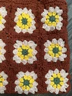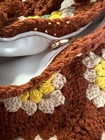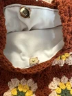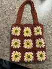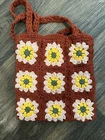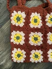 This Handmade Crochet Granny Square Tote Bag is a stylish retro shoulder bag perfect for women who love a 70s-inspired look. The exterior features a beautiful floral pattern in shades of burnt orange, yellow, and green, with white lining. The bag is made from yarn and accented with intricate crochet details, giving it a unique and artisanal appeal. The handcrafted design makes it a one-of-a-kind accessory that is sure to stand out and add a touch of vintage charm to any outfit.
