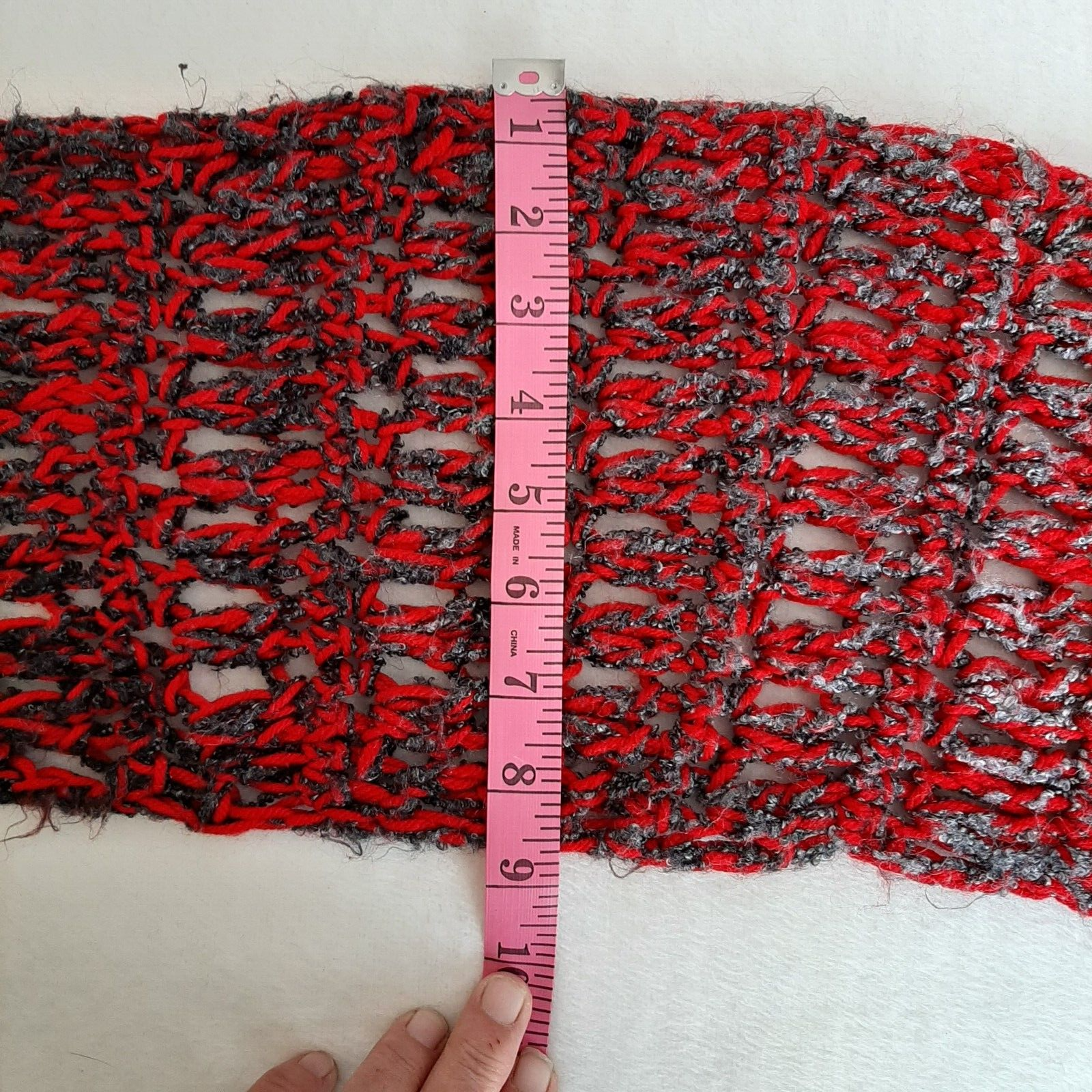 Handmade Scarf Crochet Red, Black, And Gray 86 Inches x 9 Inches. This is in excellent preowned condition. Shows signs of wear/washing/storage. This is a loose crochet stitch. PLEASE SEE ALL PICS FOR CONDITION/DETAILS/ISSUES III