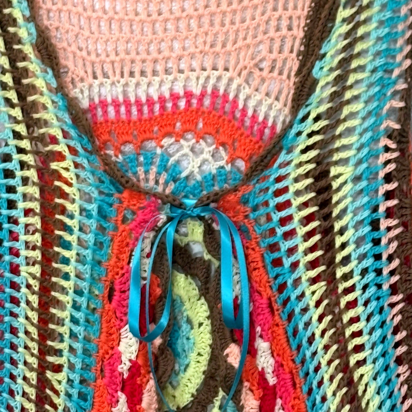 Handmade Crochet Tie-Front Cardigan Vest Small Cottage Boho Hippie Granny 70s Unbrande. No size or materials tag. It feels like cotton. Open knit Excellent used condition with no holes, rips, or stains. rainbow crochet, grannycore, hippie, cottagecore, festival fashion, boho chic, indie, fairycore, 70s retro, statement vest, southwestern, dopamine dressing