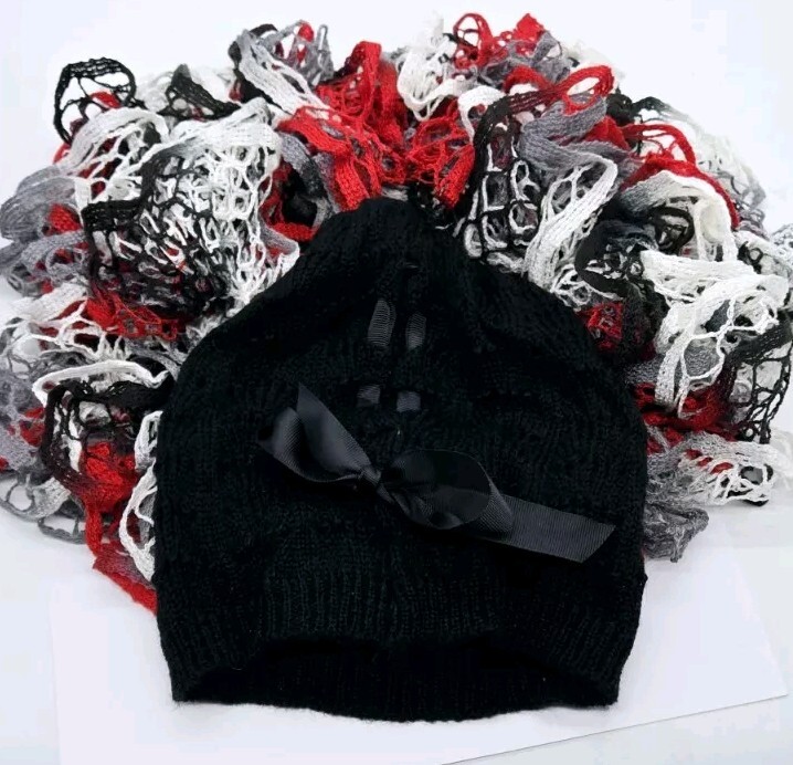 Hat - American Rag Loose Knit with Ribbon Detail NWT $24 Handmade Scarf Approx. 67 in Black Red White Grey