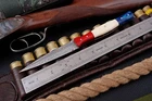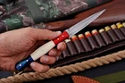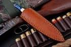 Introducing a stunning handmade dagger, made from high-quality Damascus steel, with a full tang for added durability. The double-edged blade is perfect for hunting, combat, throwing, survival, and as a boot knife. The black and silver-colored blade is 4 inches long, with a plain edge, and is paired with a wooden handle for a comfortable grip. Overall length:8.5” inch Blade 4” inch Handle 4.5” inch With Genuine leather sheath This dagger is a beautiful addition to any collection and is perfect for those who appreciate expert craftsmanship and attention to detail. With its ambidextrous design, it is suitable for both right and left-handed users. Made in the United States, this original piece also features a colored blade, adding to its unique appeal. Knife & Sheath
