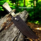 This handmade Damascus steel survival hunting bowie knife features a 5-inch blade with a fine leather sheath. The ambidextrous rat-tail tang and needle-point blade make it suitable for survival, hunting, and combat purposes. Made in the United States by Damascus, the knife has a gray blade color and a bone handle, adding to its unique and original design. Perfect for collectors or outdoor enthusiasts looking for a high-quality and versatile blade.