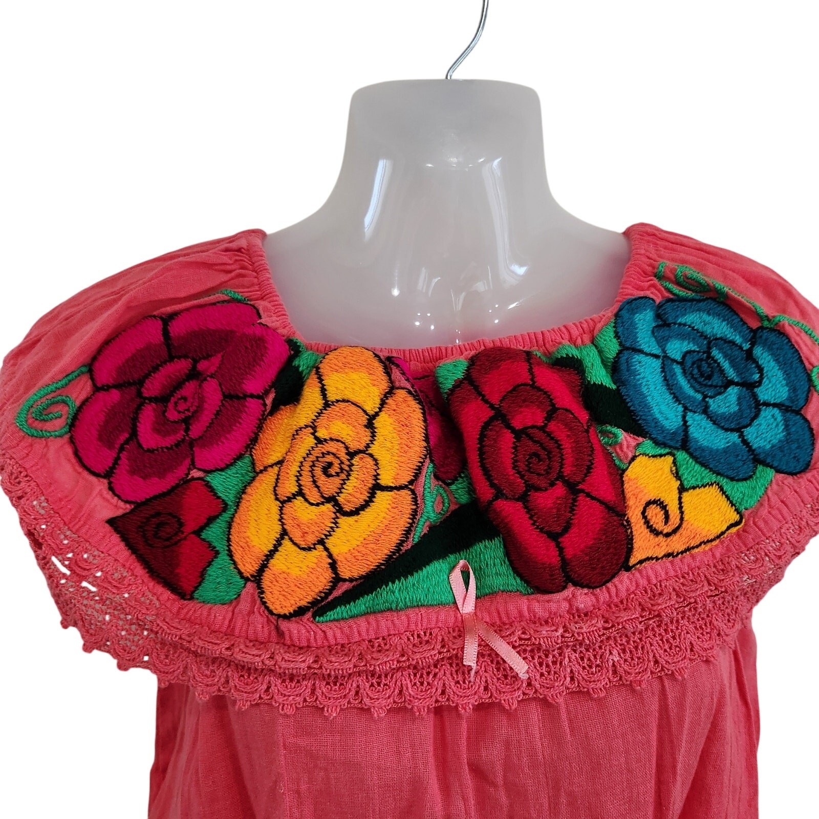 Handmade Embroidered Floral Boho Oxaca Top Pink Red Off The Shoulder Size XS Condition: Great used condition, minor signs of wear Measurement Chest: 16.5" Length: 20.5" Colorful Embroidered Off the Shoulder Blouse Peasant perfect for spring summer season.