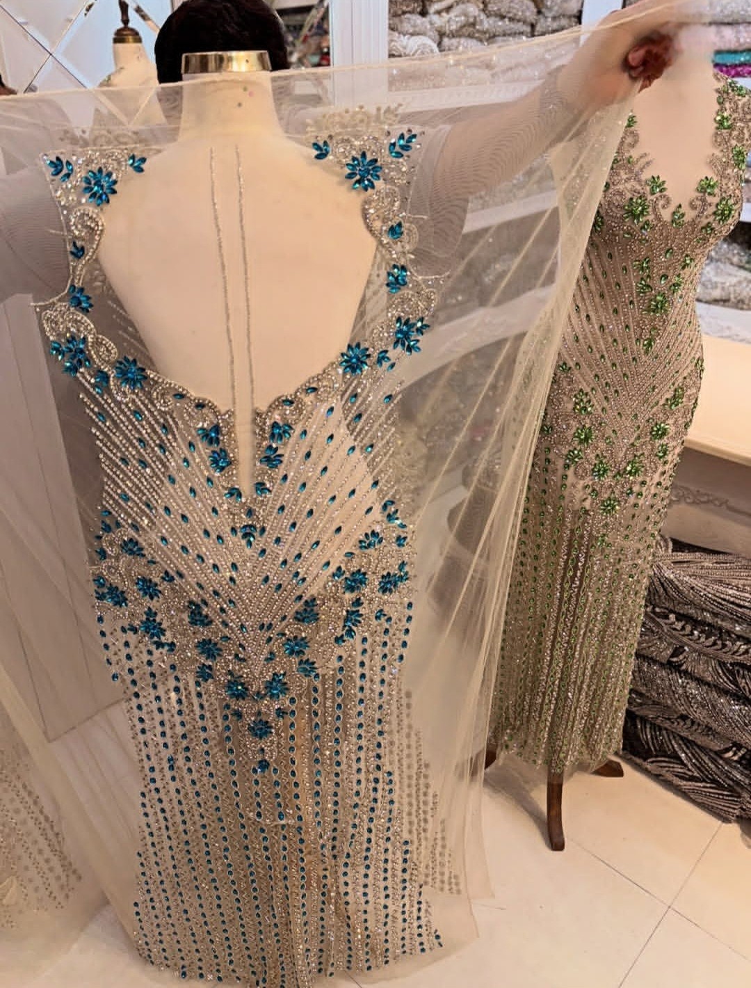 The product is a handmade full-length beaded fabric with crystal detailing, suitable for crafting apparel like dresses or dance/sportswear. Imported from India by MkZariwala, the fabric features a medium weight mesh/net material adorned with intricate beadwork and crystal embellishments, making it perfect for creating luxurious and unique garments for weddings or special occasions. Each panel of fabric is meticulously handcrafted, ensuring a high-quality and one-of-a-kind result for any crafting project. Garment Measurement in inches 20 Bust 18 waist 22 Hip 62 lenght