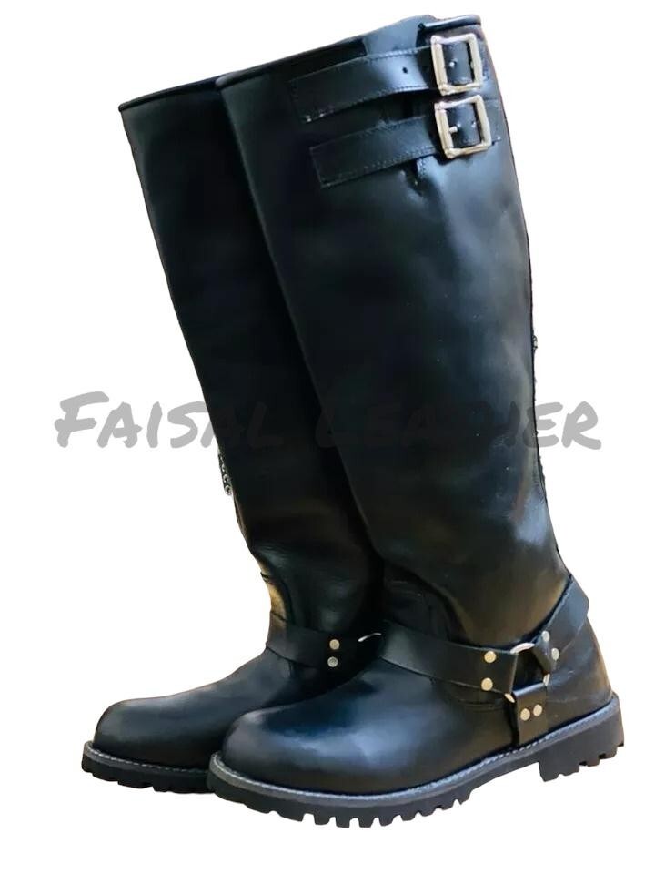 Men's Long Boots Genuine Black Leather Bikers HARLEY DAVIDSON EAGLE BLACK LEATHER TO HARNESS MOTORCYCLE BOOTS MADE WITH THE ORIGINAL COW THICK AND SHINY LEATHER AVAILABLE IN ALL SIZE High quality leather uppers Rubber soles 2 Buckle close strap Leather shipping details Our all items are handmade to order , please allow 6 to 7 working days for the item to be delivered at your door step and 6 working days for customized item. We only use FedEx & UPS (tracked) as our main courier. Return If you are not completely satisfied with the quality or any other reason, then you have the right to return or exchange within 14 days of delivery. PLEASE NOTE that buyer has to pay the shipping charges in case of return and refund. Exchange We offer our customers the best quality product. If you are not completely satisfied with the product we possibly can exchange the product with regard to customer satisfaction. Make sure that we do not send the new item, unless we obtain the old product and also the return shipping costs.