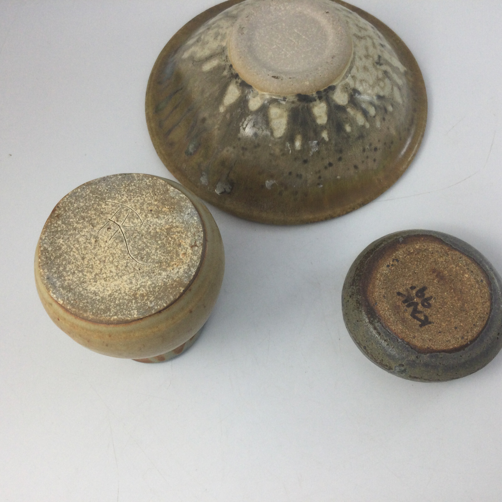 Art Pottery Stoneware Mini Vase and 2 Bowls Set of 3 Handmade Glazed. Very good condition, no chips or cracks. Vase is 3" H Larger Bowl is 6.5" W x 2" H Small Container is 3" W