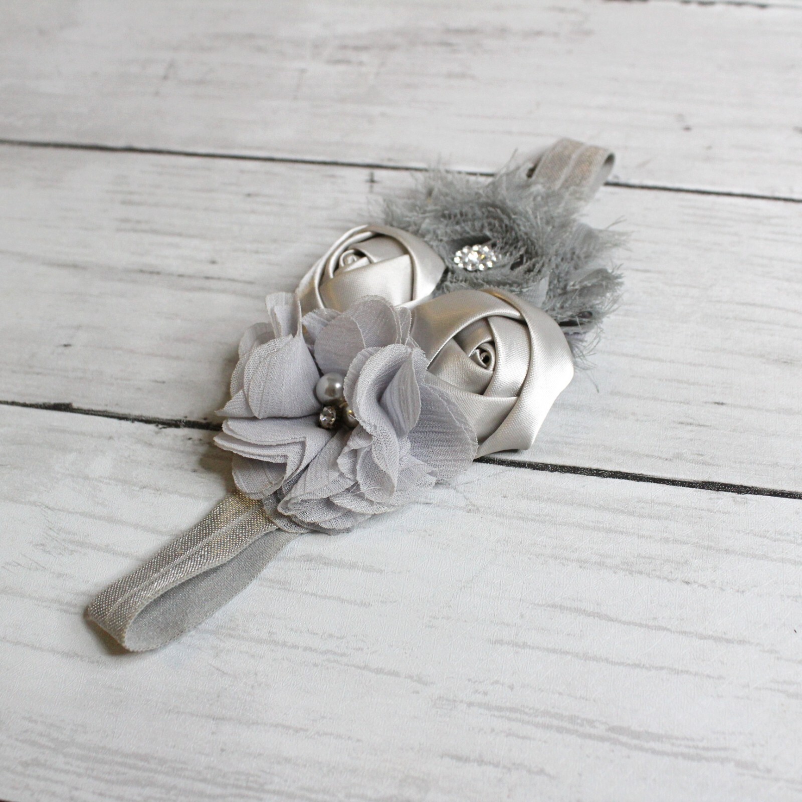 Handmade Gray Elastic Headband Infant Baby Girl One Size This handcrafted headband is solid gray with tulle flowers, satin rosettes, faux pearls and jeweled gems. It was only worn a couple of times and is in excellent hardly used condition however please know the elastic band has slight thread pulls/snags. Item contains small parts and could cause choking hazard. Use under adult supervision only.