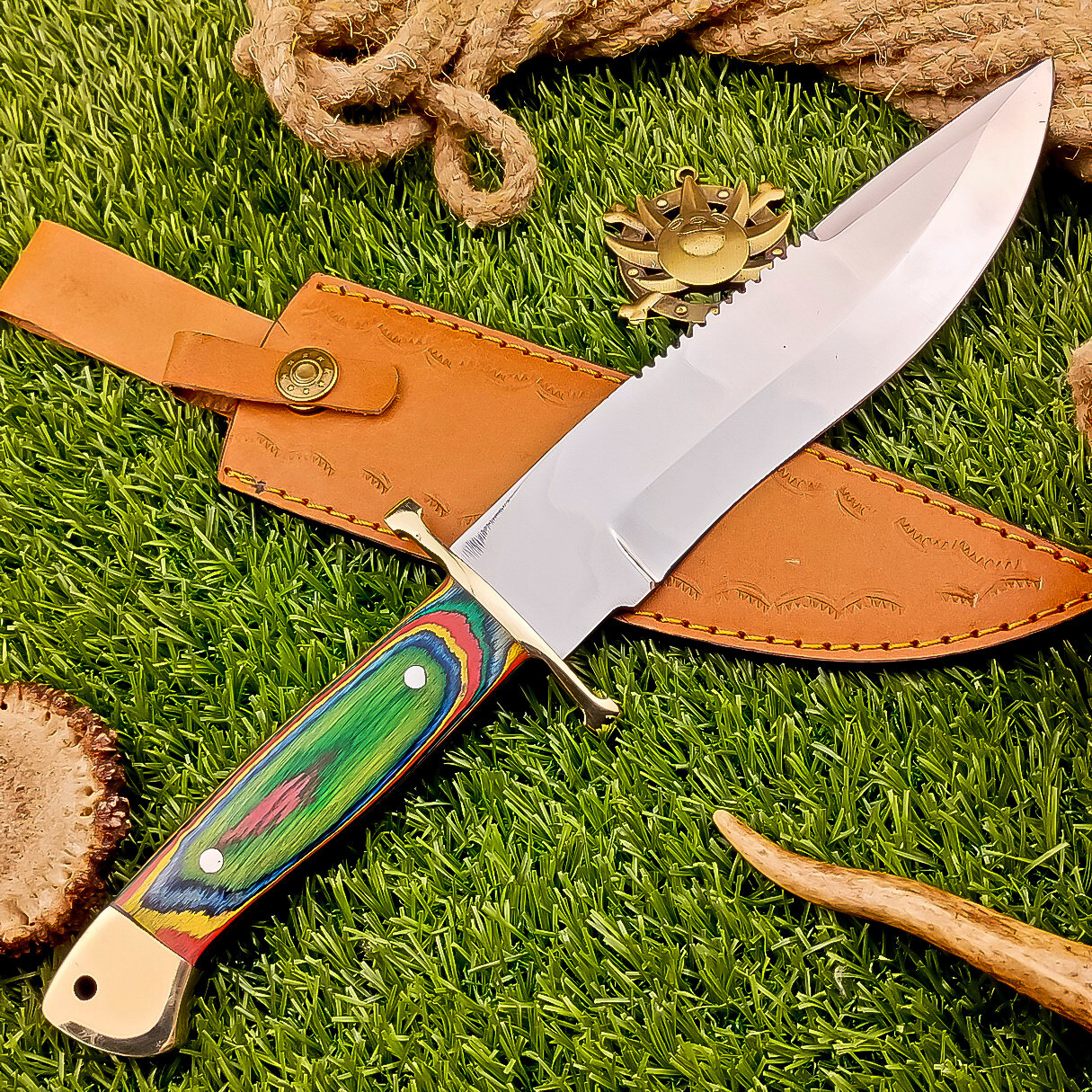 BEAUTIFUL Handmade J2 Hunting Knife, Bowie Knife, Camping Knife, Specifications: Overall Length: 12.00" Blade Thickness: ~4 mm Blade Material: J2 Steel Handle Material: Multi color Wood with brass pins with hand casted brass bolster. Includes: Leather sheath Care Instructions: Sharpen with a Diamond Wet Stone at a 20-degree angle. Clean with soap and water, dry thoroughly, and apply gun oil. Store away from the sheath to prevent rust. Important Notes for Buyers: Verify your country’s import regulations before purchase. Customs duties, if any, are the buyer’s responsibility. Shipping & Returns: Free shipping included. 14-day return policy applies. Contact Us: Message us anytime. We respond within 24 hours.