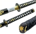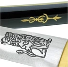 Handmade Kill Bill Bride's Samurai Katana Sword Leather Handle Kill Bill Movie Bride's sword. Blade is made of carbon steel with the devil face engraved into the scabbard. Features real ray skin and faux leather ito cord wrap. Overall Length: 39.5 " Blade: Very Sharp Blade Length: 28.5 " Handle Material: Leather and Ray Skin
