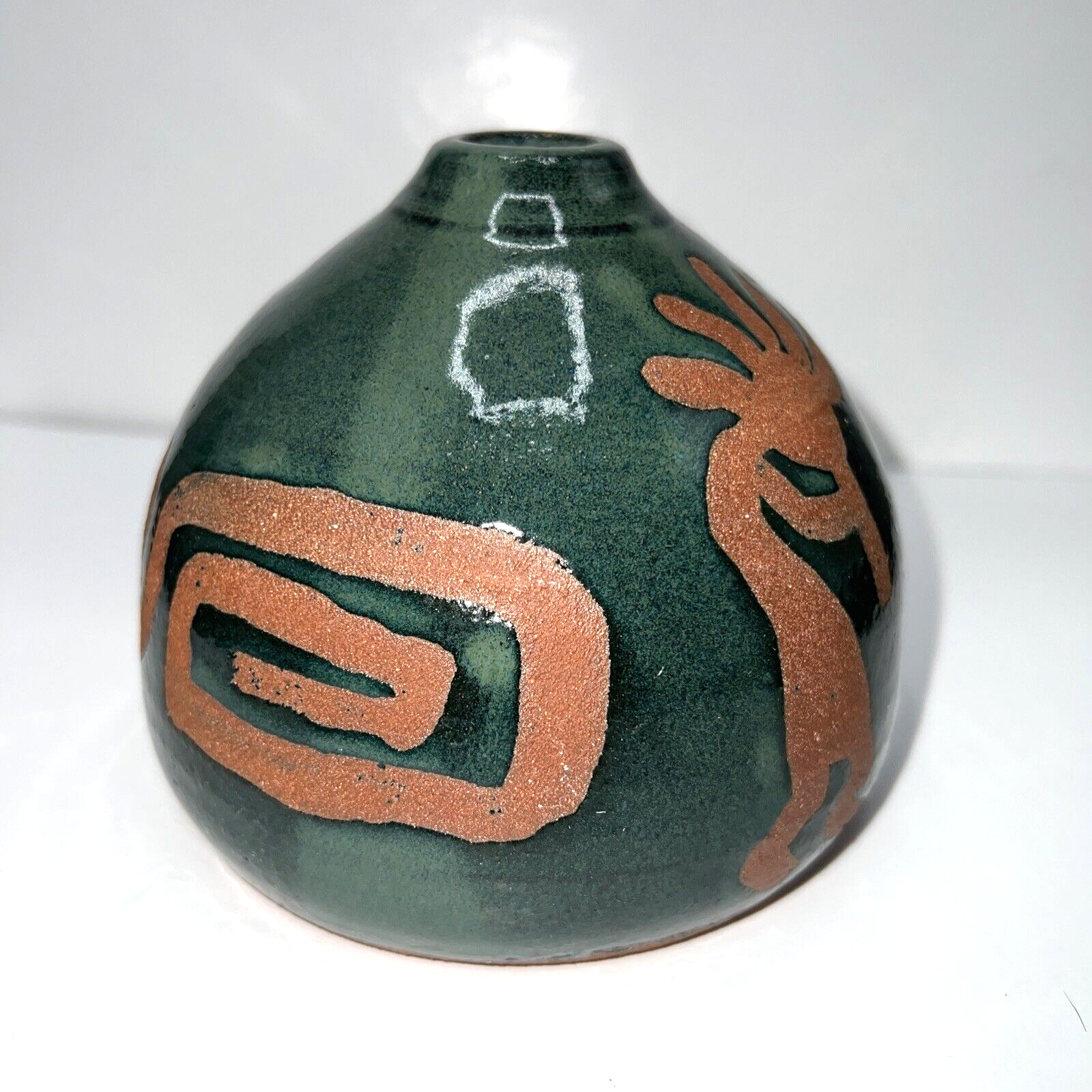This exquisite pottery vase is a beautiful representation of Southwest design, featuring the iconic Kokopelli figure and crafted from high-quality clay. The vase stands at 4 inches tall and boasts a stunning green glaze. Handmade by skilled Artisan craftsmen in the late 20th century, this original piece is a vintage item that will add a touch of Arts & Crafts/Mission Style to any room. The production technique used for this contemporary original was pottery, and it was made in the United States. This vase is perfect for collectors or those who appreciate traditional and authentic pieces. I will pack with care and get it to you ASAP Thanks for looking !