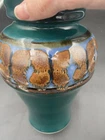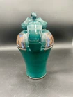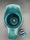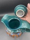 This large handmade teal green stoneware pitcher with lid is a beautiful addition to any home decor. Made by Seagrove Pottery in North Carolina, this pitcher features a ring of copper & brown drip glaze butterflies against an opalescent deep sky blue background. The ring is framed with copper, black and silver. The looped lid adds a unique touch to this original piece and seals the pitcher well. It measures 12 inches in height, 9 inches in width, and 9 inches in depth with a diameter of 7 inches. Weighing 4 pounds and 11.7 ounces, this art pottery piece is both decorative and functional. Perfect for serving guests or displaying as a centerpiece. The pitcher is in excellent condition. There are no chips, cracks or signs of wear. It is a beautiful piece of art!