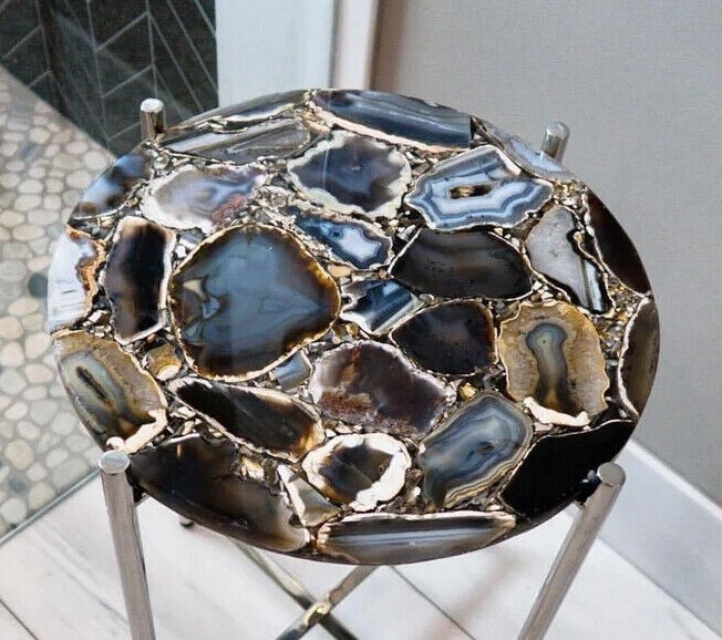 Welcome To Stone-Craft- Creations Shop Description Very unique Art by Indian Artist ,Coffee/Side Table top Used Material: Natural Agate Stones Arts Size: According to Size Variation Color: As Photo Shape: Round Pattern: Handmade Room: Bedroom, Dining Room, Hallway, Home Office/Study, Kid’s Bedroom, Kitchen, Laundry/Utility Room, Living Room,Patio, Playroom Packaging: Wood & Foam Export Packing Shipping: Air Can Be customize ,Please Message us your desired Size 1. It can be used as a Dining Table, Guest table, coffee table, center table top in show room as well as a gift for your loved ones. 2. The table top is made in Agra India & fully handmade. 3. The top will be delivered by FedEx or DHL free of cost door to door. 4. If there is any local tax,custom duties or Vat will be paid by the buyer at the destination. 5. The parcel is dispatch with proper packing & fully insured covering all kind of risk. 6. To maintain the table top is simple soap & water & dry cotton cloth. 7. If You Are Looking Something Customize, Let Us Know We Will Make For You As Per Your Design, Size & Shape. 8.Table top does not includes any wooden, marble stand or base if you like to buy marble or wooden base or stand that will be charged extra. Marble Agate Table Tops We are Manufacturer & Exporter of marble agate table tops. These marble agate table tops have different shapes like Round Table top, Octagonal Table Tops, Rectangle / Dining table tops, Square Table tops, Chess Table tops, Taj Mahal Table tops, Custom Designs Table tops also make marble Table top Base and Stand. Then we can be used as dining tables, coffee tables, Center tables, conference tables, chess boards, reading tables, bar tables , Garden table, side and corner tables or any other use as per the indoor and outdoor decor. They can also be placed outdoors in the garden, as marble is stain free, offers great resistance to the forces of nature, and can withstand heavy temperatures. We also meet customized requirement and offer our marble table tops at industry leading prices. About Agate Stone- Agate is a rock consisting primarily of cryptocrystalline silica, chiefly chalcedony, alternating with microgranular quartz. It is characterized by its fineness of grain and variety of color. Although agates may be found in various kinds of host rock, they are classically associated with volcanic rocks and can be common in certain metamorphic rocks. Ancient use of agate stone Agate is one of the most common materials used in the art of hardstone carving, and has been recovered at a number of ancient sites, indicating its widespread use in the ancient world; for example, archaeological recovery at the Knossos site on Crete illustrates its role in Bronze Age Minoan culture Types Of Agate 1. Fortification Agate This is the most common and distinctive type of agate. In these agates, bands crystallized into concentric layers that more or less follow the shape of the cavity. The banding resembles an aerial view of a fort 2. Water-Line Agate (also called water-level or onyx) During its formation, silica-rich solution either entered the cavity slowly laying one band at a time, excess water drained out leaving a small amount of silica to settle out into separate bands, or the vesicle filled under low pressure. In any case, the silica crystallization in water-level agates is controlled by gravity in one orientation, forming a stack up of parallel bands. 3. Shadow Agate Some agates exhibit a shadow effect in which there is what appears to be movement across the agate layers when the specimen is rocked back and forth (or your orientation to the specimen moves). This optical effect only occurs when there are alternating translucent and opaque bands. It is caused when light goes into the agate, but is not reflected out. 4. Tube Agate Tube Agate During the formation of some agates, parallel projections of tiny hair-thin mineral rods grow first within the silica gel, around which later the chalcedony agate micro-crystals form. In some cases the inclusions remain, but sometimes they weather away leaving hollow tubes that subsequently fill in with silica. 5. Eye Agates This mysterious agate characteristic is believed to be formed when most of the silica gel drains from the cavity, leaving only a droplet that “beads up” on the inside wall of the cavity. This droplet crystallizes into solid chalcedony “eyes”. In some cases, crystal growth will continue from this droplet in a manner similar to the formation of stalactites in caves. Later, the pocket fills in with the usual deposition of chalcedony microcrystals. 6. Plume Agate These agates initially had formations on their outside layer that formed prior to the deposition of chalcedony bands. They are filament growths of mineral inclusions that resemble ferns or feathers. 7. Geode Agate Geode Agate In some cases the supply of silica-rich water runs out before the entire cavity fills in. When there is a hollow center within a crystalline outer fill, the specimen is considered a geode. Not all geodes have agate banding, but many do. Also, the inner layers can form into several different types of silica mineral crystals and may even have other types of mineral crystals. 8. Moss Agate Moss Agate Moss agates have clusters of mineral inclusions that resemble plants, trees, or landscapes. Most moss agate inclusions are comprised of iron or manganese oxide. In some cases, the inclusions inhibit chalcedony banding allowing the mineral clusters free reign to grow within the silica gel. 9. Seam Agate Seam agates for in cracks within host rock, rather than in rounder pockets. The bands form in parallel rows that follow and fill in the crack or seam.