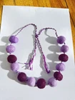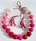 This necklace is made of felted wool balls in shades of red, pink, and cream. The balls are soft to the touch and have a pleasant fluffy texture, giving the piece a cozy and unique appearance. The balls are strung on a twisted red and white cord, creating a beautiful contrast and adding an ethnic style. The necklace is finished with tassels at the ends, allowing for adjustable length by tying it to fit as desired. The vibrant colors and handmade craftsmanship make this necklace a one-of-a-kind accessory, perfect for everyday wear and boho-inspired looks.