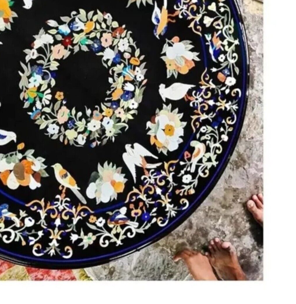 1.It can be used as a Coffee Table, Center Table Top as well as a gift. 2. The Table Top is made in Agra India & fully Handmade. 3. The top will be delivered by FedEx or DHL free of cost door to door. 4. If there is any local tax, custom duties or Vat will be paid by the buyer at the destination. 5. The parcel is dispatched with proper packing & fully insured covering all kinds of risks. 6. To maintain the tabletop, use simple soap & water & dry cotton cloth. 7. If You Are Looking Something Customize, Let Us Know We Will Make For You As Per Your Design, Size & Shape. 8. Table stand is not included, can be purchased separately. • Semi Precious Stone in use as follows 1. Lapis lazuli ———- Blue stone 2. Malachite ———- Green stone. 3. Turquoise ——— light Blue 4. Carnelian ——— Orange Red. 5. Mother of Pearl ——— White shiny 6. Eblone Shell ——— Colorful Shiny. 7. Jasper ——— Brown • What is Marble Inlay Work? “Marble Inlay work” is one of the most attractive art that is done from marble. The same type of that adorns the Taj Mahal and other Mughal monuments. It is a closely protected traditional art and only a few expert exponents are available today. The delicate process involves cutting and engraving marble shapes manually. To start with, a predefined pattern e.g., floral design or geometrical design is engraved on the marble slab. Small pieces of marble of different shades are cut delicately to fit in these grooves precisely. These small pieces are then slipped in the grooves. Apart from marble, many other materials can also be used. • History of Inlay Art: Inlay work on delicate precious stones began in the workshops of Florence in Italy around the end of the 16th century. This was known as PIETRA DURA. (Pietra= Stone, Dura= Hard) The Italians had created a classic artistic form and held a monopoly over it. From 1630 onward pietra dura appeared on moveable, small objects as decorative panels, with bird and flower motifs, suitable for cabinet fronts and tabletops. Some of these soon reached the Mughals in the form of presents. Of all the Mughal Emperors, Shah Jahan was the greatest patron of architecture in India. For him, no amount of money or time was too much to create enduring, everlasting architectural beauty and through it be remembered always. It is in his buildings that one feels most compelled to make the connection between Mughal art and pietra dura. The Taj Mahal, the cenotaphs of the Emperor and his wife, the main floor, and the surrounding marble railings bear very close resemblances to the pietra dura form.