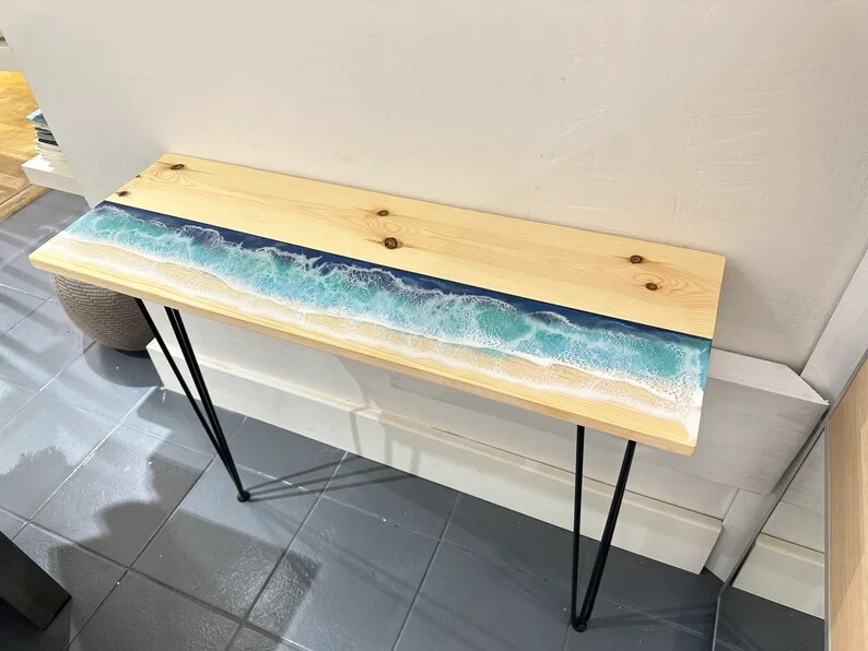 Product Information Size: 30x12 Inches Material: Wood, Epoxy, Resin & Handmade Arts Shape: Rectangle Epoxy table tops have become progressively well known lately, on account of their dazzling appearance and strength. These tabletops are made by blending epoxy pitch in with a hardener and pouring it onto a pre-arranged surface. When restored, the epoxy frames a gleaming, smooth completion that improves the regular excellence of the wood or different materials utilized. One of the vital benefits of epoxy table tops is their capacity to make a feeling of profundity and three-dimensionality. The straightforward idea of the epoxy permits the fundamental materials to radiate through, bringing about an extraordinary and eye-getting tasteful. Likewise, epoxy is accessible in a large number of varieties and gets done with, considering unending imaginative conceivable outcomes. One more significant advantage of epoxy table tops is their uncommon toughness. Epoxy is exceptionally impervious to stains, scratches, and intensity, pursuing it an ideal decision for high-traffic regions like feasting tables or ledges. This strength additionally guarantees that the table top will stay in top condition long into the future, decreasing the requirement for continuous support or substitution. Besides, epoxy table tops deal a degree of customization that is unparalleled by different materials. Planners and mortgage holders can consolidate different components like wood cuts, stones, shells, or even photographs into the epoxy gum to make an exceptional piece that mirrors their own style. The capacity to feature novel and significant items inside the tabletop adds a nostalgic touch to the general plan. Notwithstanding, it is crucial for note that making an epoxy table top requires cautious planning and ability. The surface should be appropriately sanded, cleaned, and prepared before the epoxy is poured to guarantee a perfect completion. Also, the restoring system can require a few days, during which the table should stay undisturbed to forestall defects. All in all, epoxy table tops are a famous decision for those looking for an outwardly dazzling and sturdy surface. With their capacity to improve the excellence of materials, endure day to day mileage, and proposition unending customization choices, epoxy table tops have secured themselves as a go-to decision for inside creators and property holders the same. Kindly Note:-- As raw wood is used in its natural form and shape to make the table, the table shown in the photos has already been purchased so actual product may vary from the picture shown. This is only table, any kind of legs ( Iron, Wooden, Marble ) is not included in this price. If you want any kind of legs so please message us. You can customize your product easily like:- Shape , Colour , Size & Design. Thanks for Visiting.....