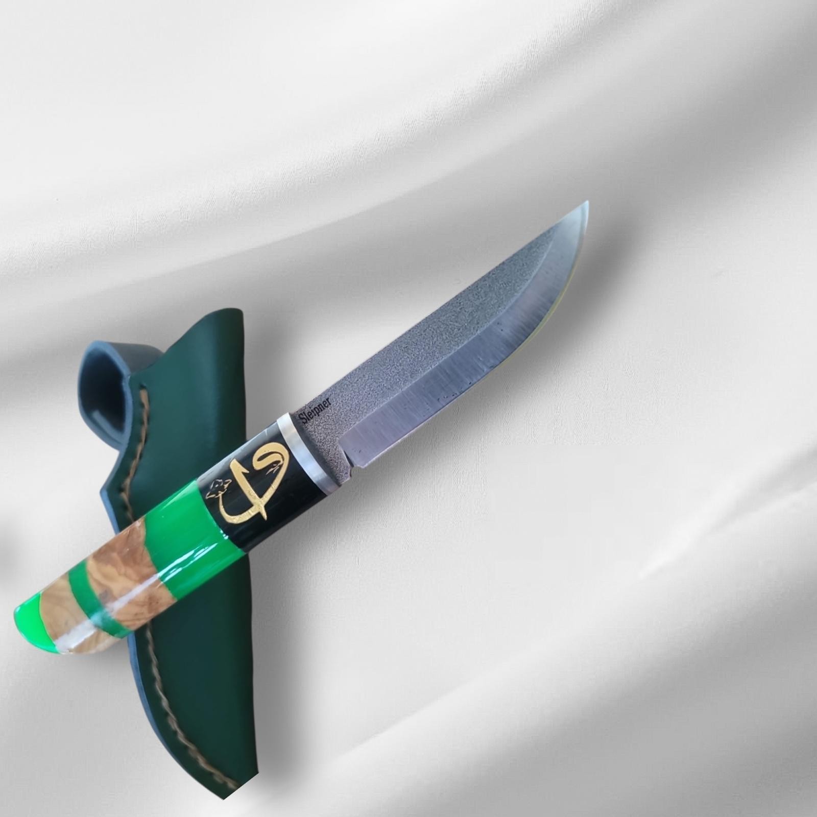 Ürün Açıklaması (Description) Experience the Fusion of Art and Power This handcrafted hunting knife is a masterpiece of modern bladesmithing. Featuring high-end Sleipner Steel and a breathtaking hybrid handle, it is designed for the serious outdoorsman and the elite collector alike. ✨ Highlights: Premium Sleipner Steel: Engineered for extreme durability and exceptional edge retention. This blade is built to perform in the toughest conditions. Artisanal Hybrid Handle: A stunning blend of natural Walnut wood and vibrant Green Epoxy resin , creating a unique visual flow that is as ergonomic as it is beautiful. Custom Calligraphy Inlay: The handle features a unique golden-toned inlay, adding a touch of cultural elegance and exclusivity. Hand-Stitched Leather Sheath: Comes with a custom-fitted, deep green leather sheath that complements the handle's aesthetics while ensuring safe carry. 📏 Technical Details: Steel Type: Sleipner High-Performance Tool Steel Handle Material: Stabilized Walnut Wood & Designer Green Resin Blade Finish: Professional satin/matte blend Included: Genuine Leather Sheath (Dark Green) Condition: 100% Brand New, Hand-forged