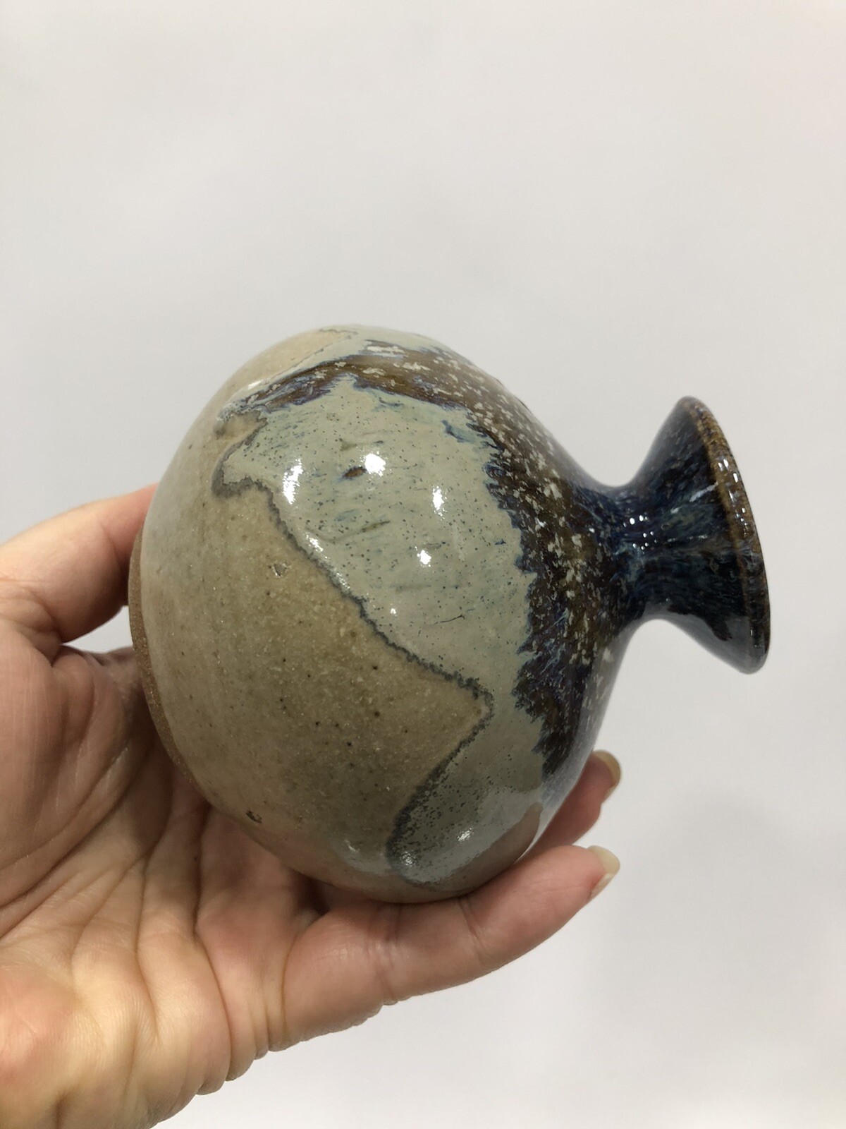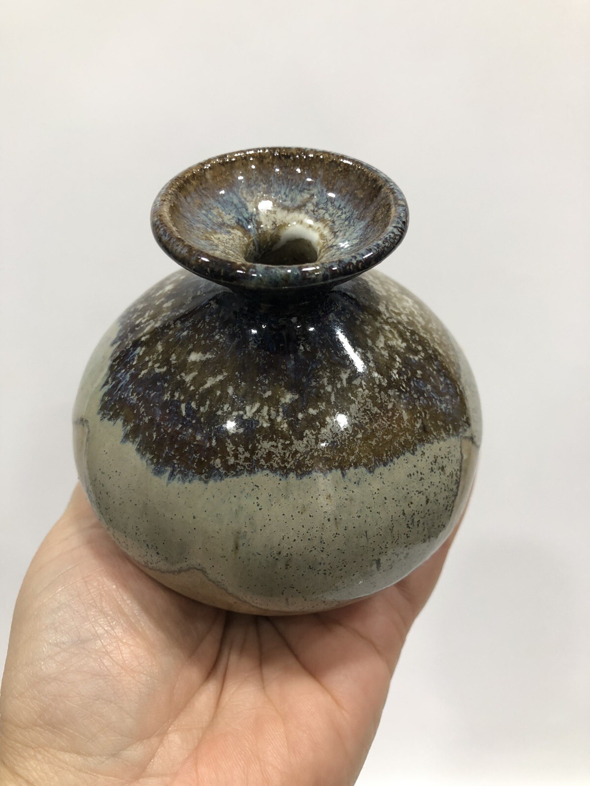 Beautiful Round Vase Stoneware Studio Art Speckled glaze, mottled on rim & inside Handmade Artist Signed on the bottom earth tones. Condition is "Used in great shape! 4.5”Tall; 1/2” diameter.Shipped asap by USPS Priority Mail.
