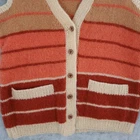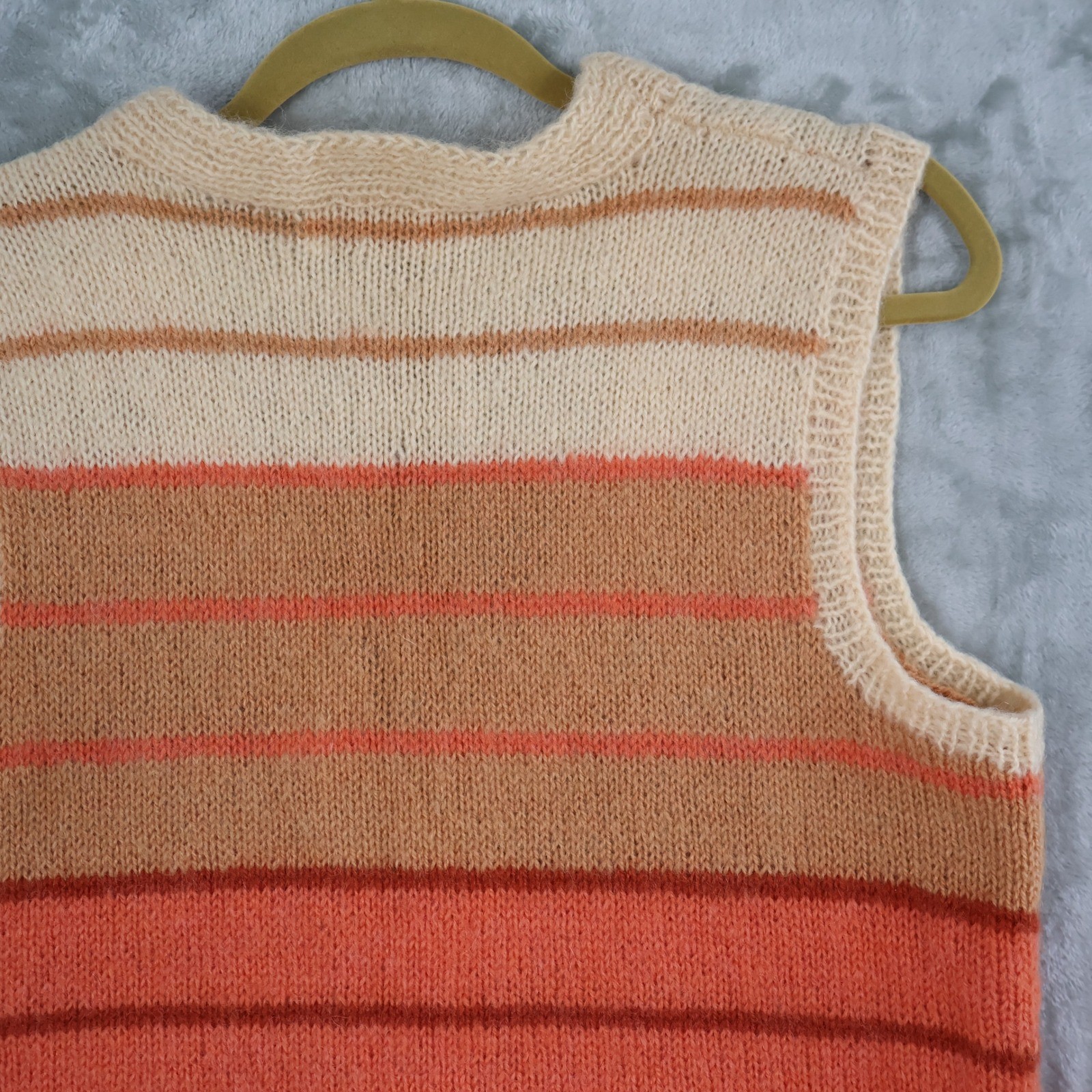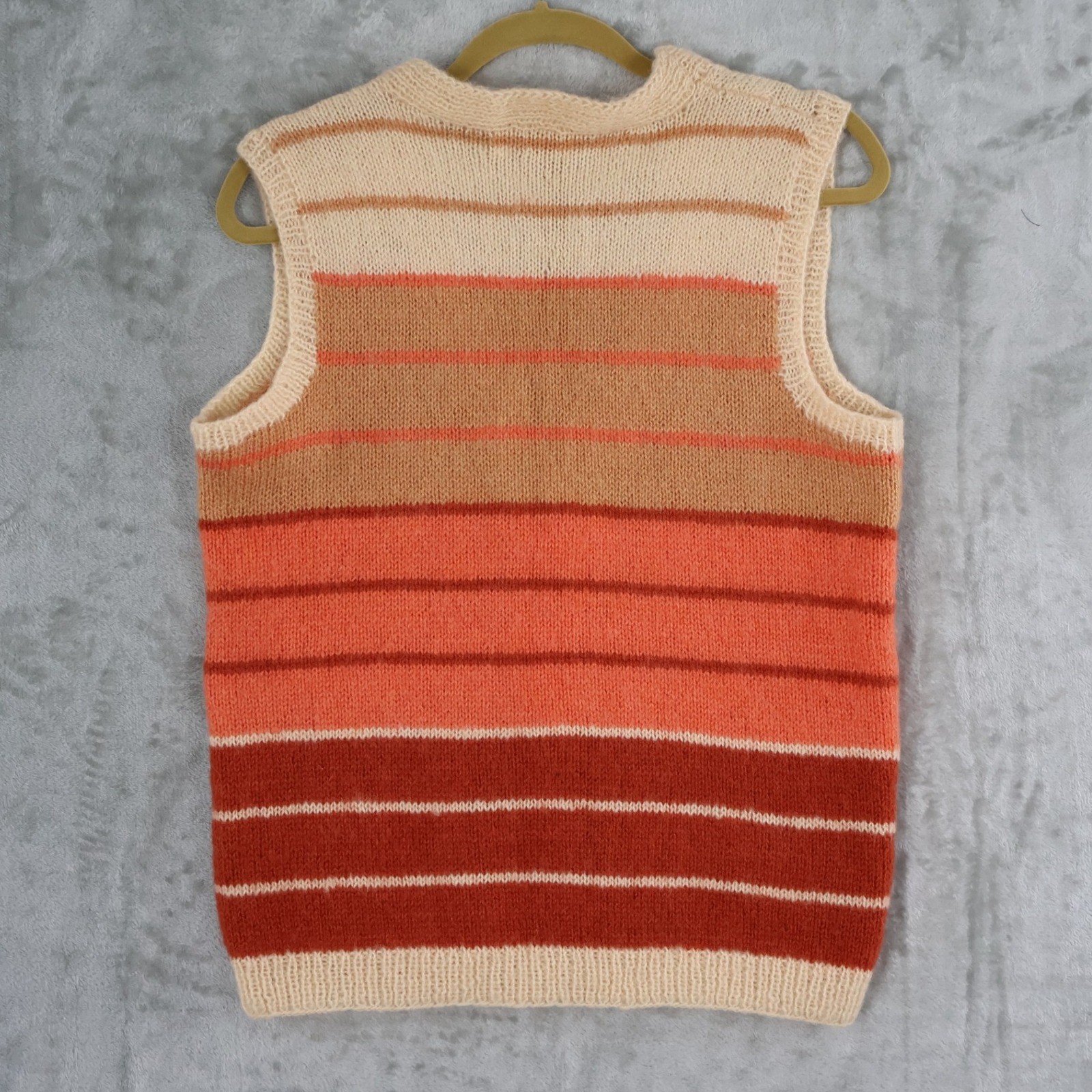 A vintage knitted vest from Birgitta De Long Knitting Needles (someone's Grandmother?) with a multi-color stripe pattern. This sleeveless cardigan features a V-neckline, a button-front closure, and two front patch pockets. Perfect for layering over a t-shirt or blouse for a casual outing or a cozy evening at home. Siz has been estimated based on measurements: • Bust: 18.5 in • Length: 24.5 in Type: Vest Department: Women Accents: Button Features: Open Fabric Type: Knit Pattern: Striped Closure: Button Occasion: Casual Theme: OOAK, Unique, Handmade, Retro, 70's, classic •All clothing items have been steam sanitized or washed. •Please compare the measurements to something you already own.