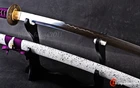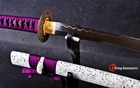 Product Parameter : Package: 1 sword+1 certificate+1 bag Number: LQ151235 Swordsmith: Craft: Fully hand forged, mirror polished, Clay tempered,Oil Quenching,etc. Material: Clay tempered T10 high carbon steel Fittings: Alloy,Samurai design Ito&Sageo: Purple Japanese synthetic silk Saya: White l acquered wood saya Hardness(HRC): 60 Overall: 103cm/40.6" Blade: 70cm/27.5'' Handle: 26cm/10.24'' Widdth: 3.2cm/1.26'' Thickness: 0.7cm/0.28'' Bo-hi: without blood groove Hamon: Yes, handmade real hamon It' s a functional sword,Professionals can use it to cut bamboo,paper,water bottles,etc. * Handmade swords, each one may vary slightly in color, size, weight. Each sword is unique. Manual grinding: Using the unique bright stone of Longquan Town, hand grinding, very test sword casting skills and technology, grinding out the pattern effect is special texture! Ancient quenching: Modern vacuum heat treatment can meet the hardness requirements of most swords, but the traditional quenching method has better effect, can soften the medium strip steel, and the hardness is higher. Tsuba & Fuchi & Kashira & Habaki Saya Additional Service About us Delivery details Tsuba & Fuchi & Kashira & Habaki Alloy Tsuba Iron Tsuba ( extra $10) Brass Set ( extral $50 ) Alloy Fuchi & Kashira Habaki TSUKA-ITO & SAGEO Tsuka-ito is the wrapping of the tsuka and sageo (下緒 or 下げ緒) is a hanging cord that is passed through the hole in the kurigata (栗形) of a Japanese sword's saya. SAMEGAWA Samegawa(鮫皮)is the ray or shark skin wrapping of the tsuka (handle/hilt). Saya Please contact us before placing an order to see if there is any stock available, as well as any additional charges. OX Horn Saya Additional Service It's free for engraving English words, Chinese Characters and Japanese Kanji , etc. You need pay extral $20-30 for engraving patterns. Hamon We can add or remove the machine-made wavy hamon for free. Bo-hi ( Blood Groove) Usually thought be used for bloodletting only. It is also used to lighten the weight of the sword. We can add or remove Bo-hi for free Sharpness Most of our blades are sharp. We can also make the blade unsharpened for free if you require. Colored Blade If you want to change to a different color blade, please contact us before purchase. Matching Swords Set If you buy one katana, we can make a matching Wakizashi or Tanto for you. The price varies from different swords. Please contact us if you need make custom matching set. About us We have our own sword-casting factory. The factory is located in Longquan, a small town with a long history of sword-casting in China. Most of the famous Swords in China are made there. Rich raw materials, skilled technology, traditional sword casting technology from generation to generation. Manual production really takes a lot of time. We will prepare most products in advance ,and arrange delivery within about a week. However, sometimes the delivery time is delayed due to weather or raw materials,etc. we hope to get your understanding. Feel free to contact us to inquire about the status of your order. Each handmade sword is unique. Our swords are great for gifts or for your own collection. Our swordsmithing master makes every sword attentively, hope you can feel our sincerity. We will also give you the best customer service, any questions please feel free to contact us. Delivery details a) Import duties, taxes and charges are not included in the item price or shipping charges . These charges are the buyer’s responsibility. b) If you do not receive the package, or the package is damaged during transportation. We'll take care of it. Please feel free to buy. c) If it is mentioned in the product description that the package includes the sword bag or sword holder , the style will be random. The sword holder or sword bag on the ebay picture is the props we use for shooting. If you really like a style, please contact us before buying. d) If you have any problem after recieve the package (wrong size, wrong style, etc.). We always provide you with the best after-sales service. Please give us a chance to help you before you give us a bad feedback . Thank you very much!