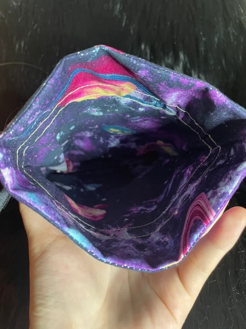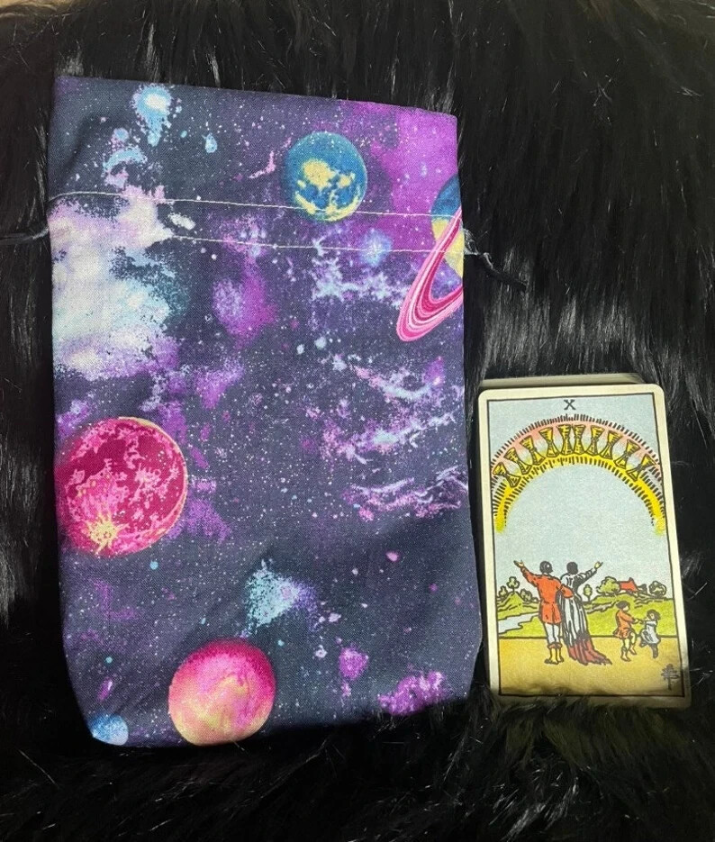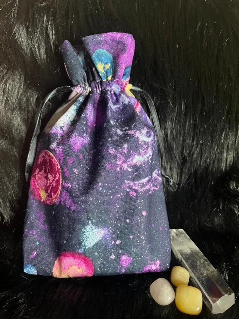 This product is a handmade tarot bag designed to hold tarot cards, oracle cards, pouches, runes, and Lenormand cards. The bag is made in the United States and is specifically designed for those who practice Wicca and Paganism. The design of the bag features a cosmos galaxy theme, which is perfect for those who are interested in astrology and the universe. ~~~~~~ The Cosmos Planet Tarot Bag is made of 2 layers of 100% cotton fabric with ribbons and be measured at approximately 6 * 9 inches (15 * 23cm) Suitable for Tarot decks, Oracle cards *In the picture is the Smith-Waite Centennial Tarot with approximately 2.75 * 4.75 inches (7 * 12cm) If you have any questions, feel free to ask, and we will reply to you ASAP. Enjoy your shopping ;)