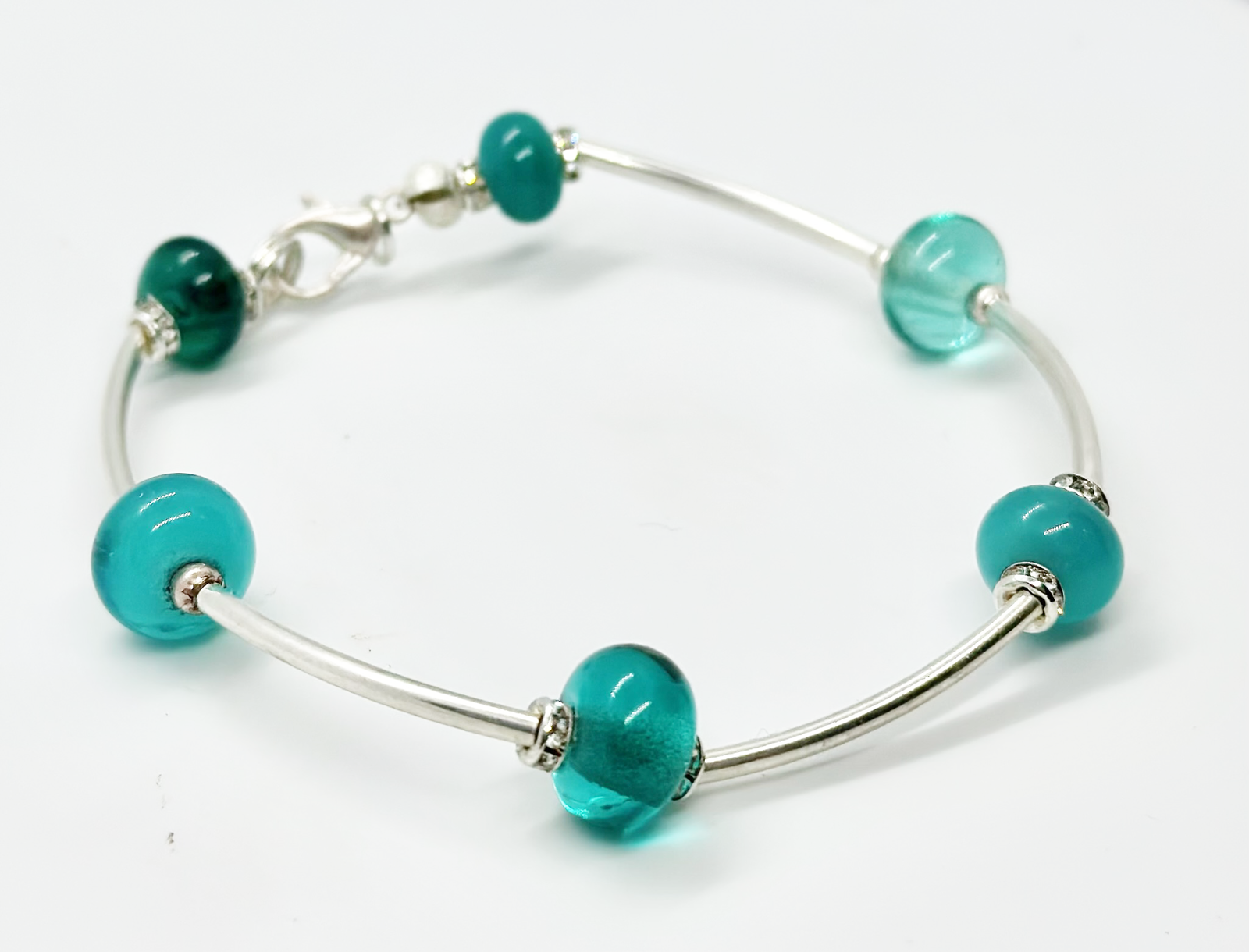Make a statement with our Teal and Turquoise Beaded Bracelet, featuring six stunning glass beads handcrafted by flamework artist Ami Morency. Each bead showcases a unique shade of teal or turquoise, ranging from light to dark, creating a beautiful gradient effect. The beads are separated by silver-plated tube beads, adding a touch of elegance to this colorful piece. This bracelet is perfect for adding a pop of color to any outfit. Wear it alone or stack it with other bracelets to create your own unique style. Shop now and add our Teal and Turquoise Beaded Bracelet to your jewelry collection today!