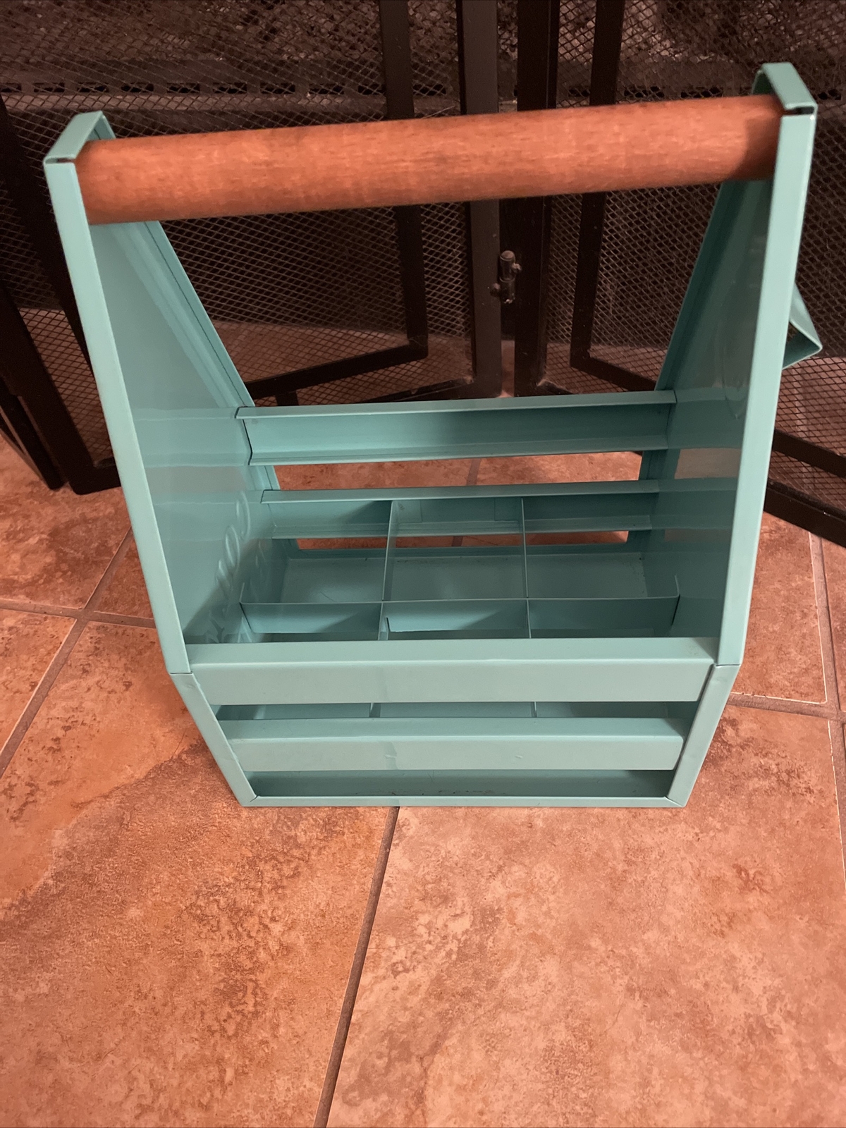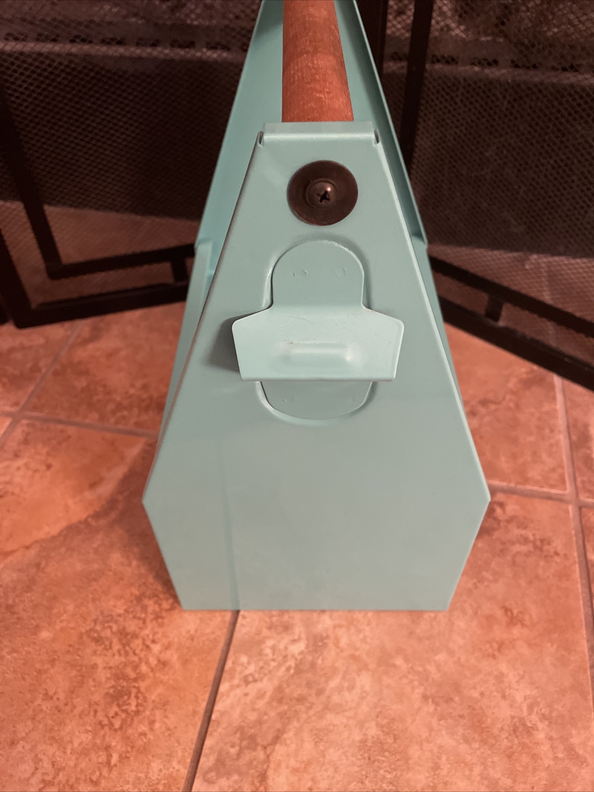 Teal colored, metal, Cold Beer, 6 pack carrier with wooden handle and attached opener. Stands 12” tall and 9” wide. Holds 6 bottles. No dents or imperfections. Made in Turkey. Great pre owned condition.