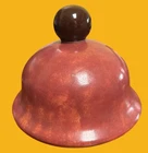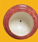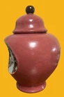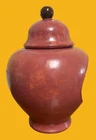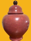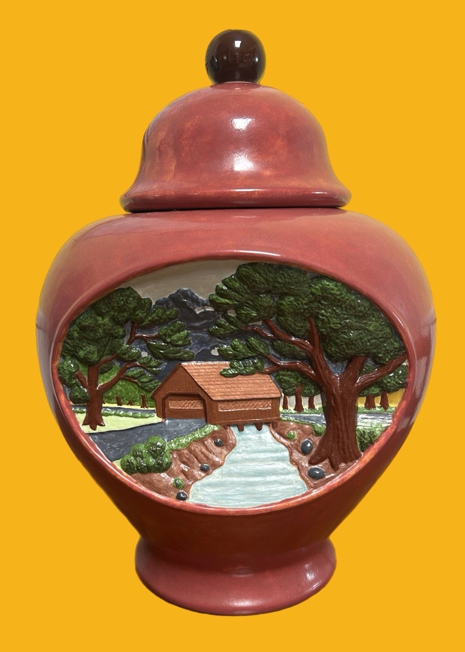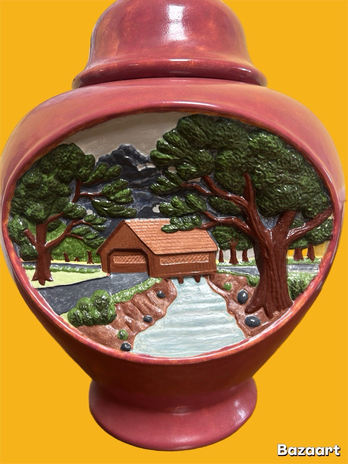 Crafted with meticulous attention to detail, this vintage ceramic pottery vase embodies the charm of Indiana's covered bridges. A true testament to the Arts & Crafts/Mission Style, the vase features hand-molded forms, etched designs, and a high gloss finish that brings out its natural beauty. Its maroon color and rustic pattern are in harmony with the great outdoors, making it a delightful decorative piece for any nature-themed space. The vase, originating from the United States in the 1980s, is a genuine example of art pottery from the late 20th century. As a unique, handcrafted item, it stands out with its 3D effect and hand-painted accents. Its robust construction is a testament to the craftsmanship of the era, making it not just a decorative item but a piece with a story. The lid comes off. The vase is 17 inches tall with the lid attached. The vase is 10 inches wide. The base of the vase is 6 inches. There is a slight chip when you lift the lid on the lip of the inside of the vase as shown in picture.