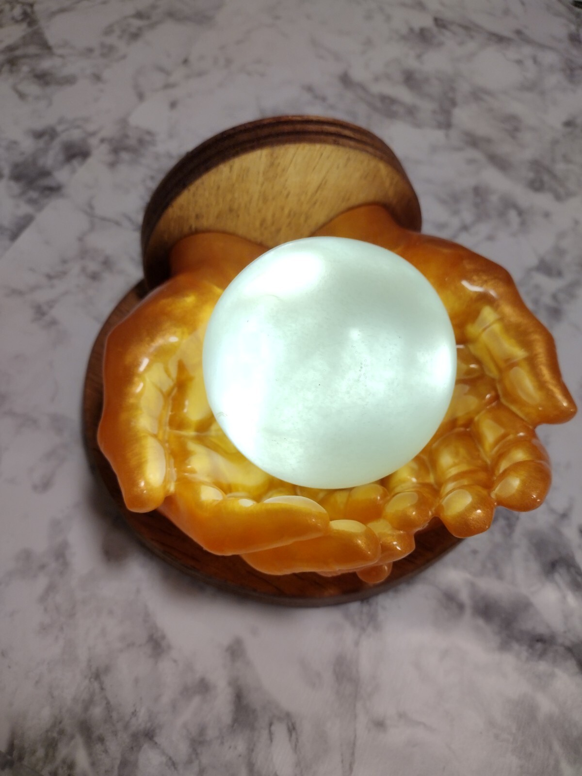 Handmade Epoxy/Resin, Wood base night light "Enlightened Hands" keepsake. Hello and thank you for considering this item! Please keep in mind this item is handmade and may vary very slightly if at all. This is a new item concept I came up with and it is made of plywood approximately 3/4" thick and features LED fairy lights embedded within the sphere, which gives it a very strong and beautiful 3-dimensional quality. The lights take 2 double A batteries (not included). Please also be aware that I do custom designs as such this item can be customized by making the hands and/or the sphere different colors. The only limit is your imagination! Thank you again!