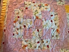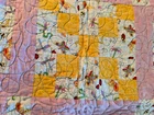 Lovely quilt is very soft and light with light batting. The sashing is lavender. Lighter fabric for the squares is butterflies, ladybugs and more; mixed in with a variety of other color squares.Bright and colorful. Very well done. Machine stitched. The trim is a bright yellow satin or silk; shiny. Backing is bright green. Fully quilted; see pic from the back. Please see our other items and combine shipping. Many thanks! jo 7