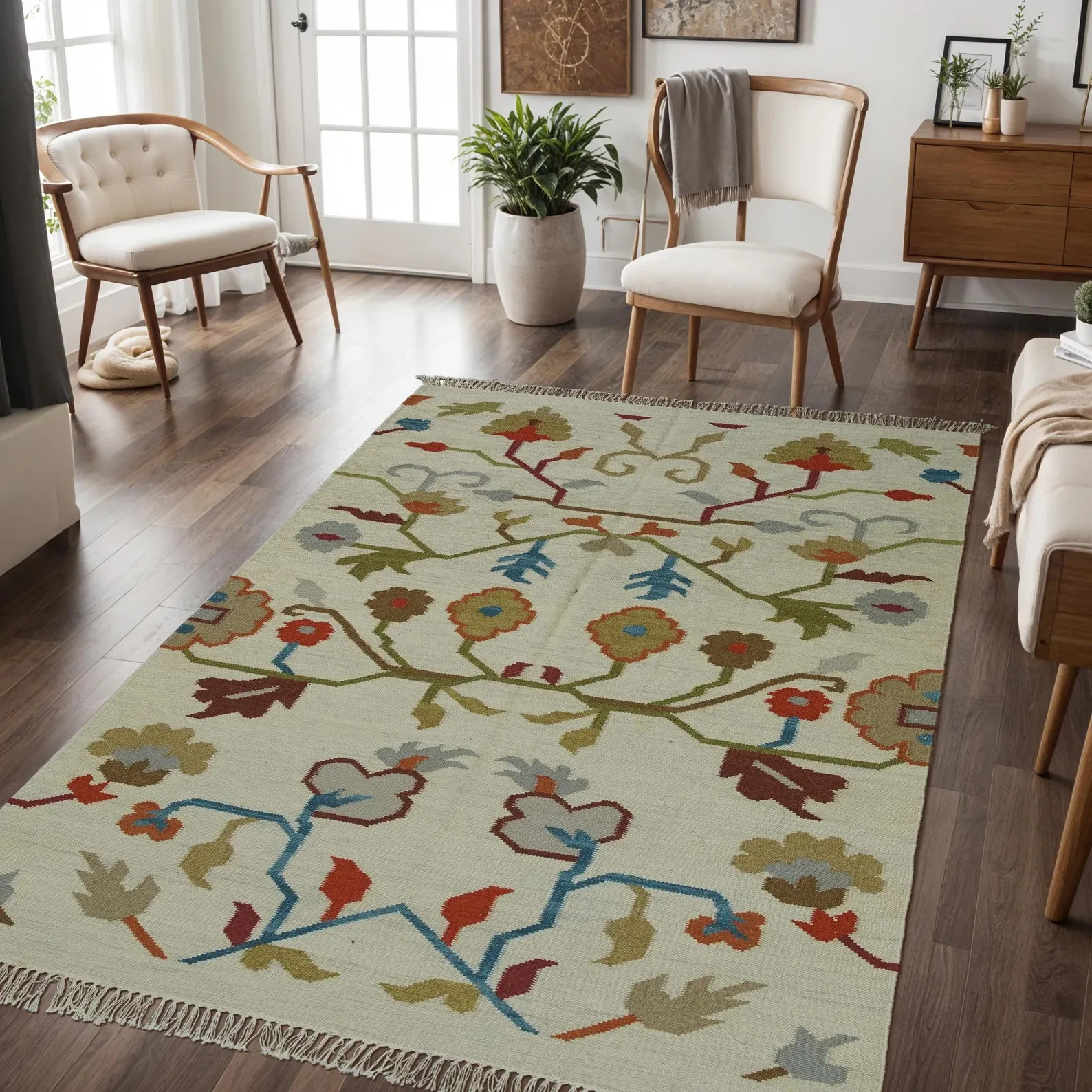 Bring warmth and charm into your home with this Handwoven Floral Kilim Rug. Set on a soft cream base, the rug features a lively mix of colorful floral and vine patterns that instantly brighten any space. The design feels both traditional and modern, making it easy to pair with all kinds of furniture and décor styles. Made from 100% cotton and woven on traditional Punja looms by skilled artisans, this flatweave dhurrie is lightweight, reversible, and easy to maintain. Perfect for the living room, bedroom, or even a cozy reading nook, it adds just the right touch of comfort and style. Why You’ll Love It: Handwoven by artisans using traditional techniques Cream base with multicolor floral & vine motifs Flatweave and reversible for practical everyday use Made from 100% natural cotton Works beautifully in living rooms, bedrooms, or dining spaces Lightweight, eco-friendly & easy to fold or clean Uses - Dhurries have a variety of uses depending on their sizes: • Table cover or table runners • For meditation, Yoga and Prayer • Floor covering- to liven any room in your houses • Can be used as wall hangings • Can be used as a tapestry for sofas and chairs Size - Variable and customizable Color - Beige Flower Care - Machine cold wash Size is customizable according to specific needs. For any bigger sizes or bulk queries, please feel free to contact us. Do visit our Etsy shop to see a wide range of products we have to offer to beautify your home.