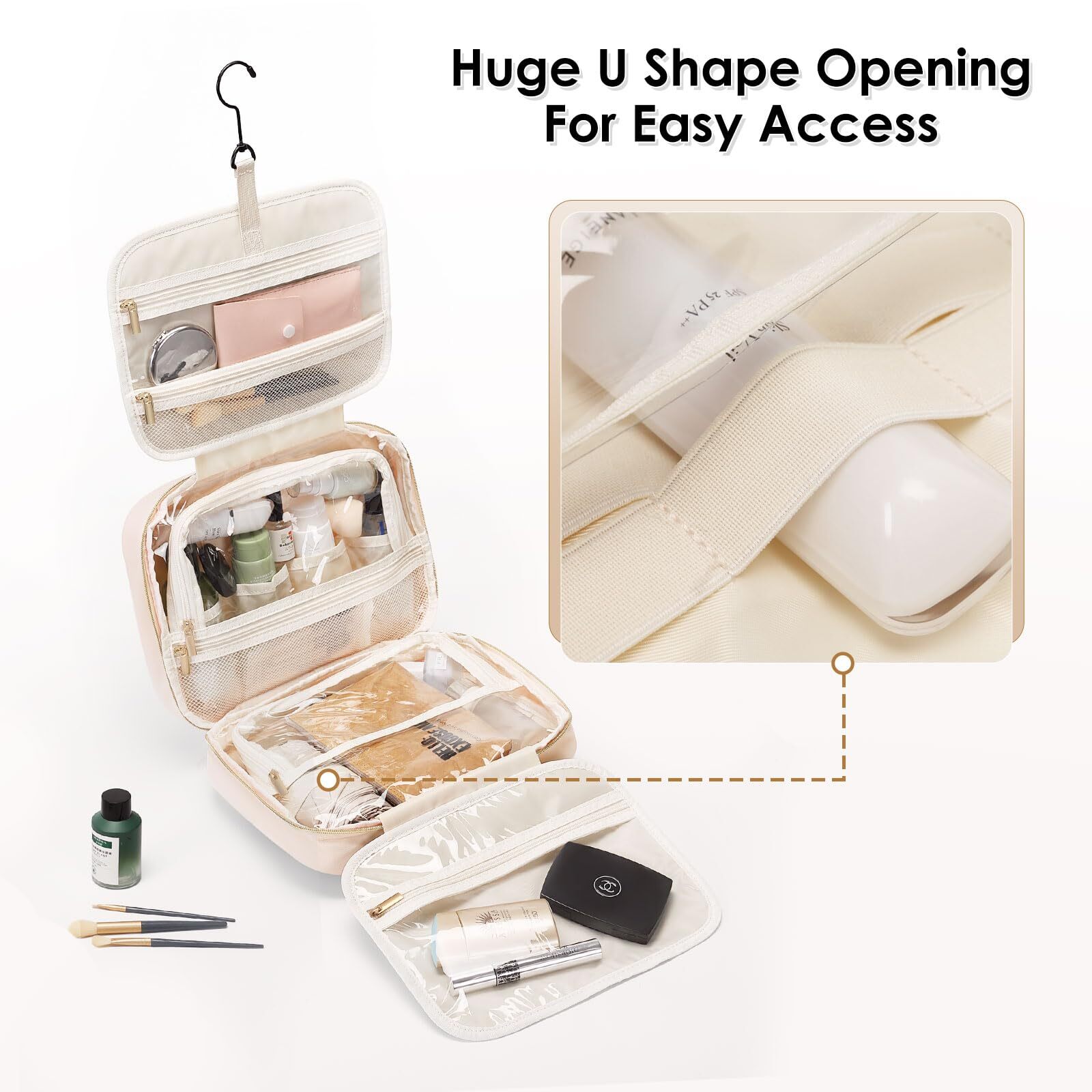 MDODO Travel Toiletry Makeup Bag for Women Hanging Toiletry Bag Cosmetic Organizer Make up Bags for Women Travel Essentials (Beige) Hanging Design: Our makeup organizer bag can stow-away 360-degree swivel non-slip metal hook for versatile hanging options; cosmetic bag carry handle doubles as its hanging strap; two-way zipper closure for quick access Travel Essentials: This hanging travel toiletry bag is perfect for business trips, travel, camping, and family outings. You can also make a good choice to use as a present for women, BFFs, friends, and family for various occasions like birthdays, Christmas Day, and Valentine's Day Easy to Carry: MDODO Makeup travel bag dimension: 11.8L*9.3H*3.9D inches (rolled), Weight: 1.36 lbs, lightweight and easy to carry, great for overnight staying, a long journey, gym shower, and outdoor activities.We add brush organizer compartment in the front pocket of travel make up bag for various makeup brush, meeting your travel toiletries and makeup needs Large Capacity Travel Must Haves: MDODO makeup bag has 5 separate compartments inside the travel makeup bag to keep all your items organized.Inner main pockets with elastic straps hold bottles upright; this travel toiletry bag design double zipper compartment for easy access to the items even not fully open the bag; Transparent sides for providing clear overview of contents. Space-efficient toiletry/make up bag hold your full-sized essentials, lotions, shampoo, powder foundation Water-resistant and Easy to Clean: MDODO toiletry bag for women is made of water-resistant Polyester with supple touch; Segment dry and wet stuff-clear pockets combines with mesh compartment. Neat and organized. Not worry colored liquid will ruin the toiletry bag any more. Different size elastic straps fit for sizes of bottles. This toiletry travel bag can hold many items with sturdy stitching and heavy-duty material. Well-padded design to keep full bag's shape and provide great protection SHIPPING Domestic Buyers - We have confidence in our products, but if you are not fully satisfied please contact us within 30 days of purchase and you will get full refund. - We ship within 3 business days of payment, usually sooner - We offer FREE shipping on all orders! - We only ship to the lower 48 states, no APO/FPO addresses or PO Boxes allowed International buyers – please note: Import duties, taxes, and charges aren't included in the item price or postage cost. These charges are the buyer's responsibility. - Please check with your country's customs office to determine what these additional costs will be prior to bidding or buying. * Order Cancellation Policy ** You can return a product for up to 30 days from the date you purchased it. 1. The seller reserves the right to cancel the special case only due to eBay cancellation fee. 2. The decision of seller is the final. 3. The seller will respond to the cancellation request within 2 business days. Please wait for the result of cancellation. 4. In case the cancellation is not completed by some reasons, the buyer can follow the options below to get the refund. 4.1 The buyer can reject the item when it arrives. 4.2 The buyer can send the item back to the seller within 30 days If the buyer receives item (USA Shipment ONLY). The seller will provide the FREE return label to the buyer when the buyer opens " Return Item" case on eBay by using the reason as "Change my mind" ONLY. 5. When buyer has placed the order. The order will be processed and completed by automatic warehouse system within 5 minutes. In case that buyer sends the cancellation request after 5 minutes of placing the order, the request will be rejected. **Sending direct message to cancel the order is not allowed for every case.* Return Policy For the return case - If buyer would like to return the items for refund or replacement, please CONTACT SELLER to receive the free return label from seller. The refund or replacement will be processed with the tracking number of return label which is provided by seller only. The other ways of return which are not approved by seller will not be processed for the refund or replacement.