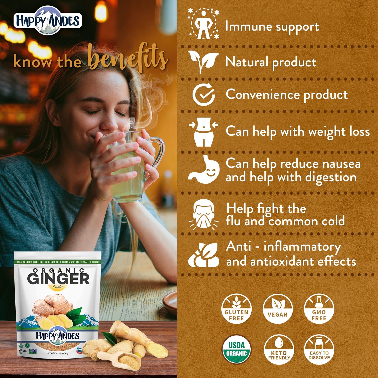 Ground ginger is the peeled, dried, and powdered form of Ginger a root native to Southeast Asia, India and China. Cuisines around the world use ginger as an aromatic ingredient, and the spice also has a long history as a treatment for nausea, motion sickness, gas, bloating and other digestive complaints. PERUVIAN GINGER: The Peruvian ginger is characterized by having a better aroma and more intense flavor than the conventional one. The powder also dissolves easily in water. PACKED WITH NUTRIENTS - Give your body a nourishing boost with our organic ginger powder. Rich in vitamins, minerals, and a bioactive substance called gingerol, it's much more than just a yummy spice! VERSATILE ROOT- Ginger be used for variety of things!, from cooking to just drinking it mixed with plain water.Take it in Teas,Smoothies,Juices, Homemade jams, Bread, Drinks, Desserts and Cookies. BUY WITHOUT WORRIES - Make our non-GMO peruvian ginger powder part of your daily routine!. This 100% ground ginger powder is USDA Certified, Gluten Free and Keto Friendly. Almonds free
