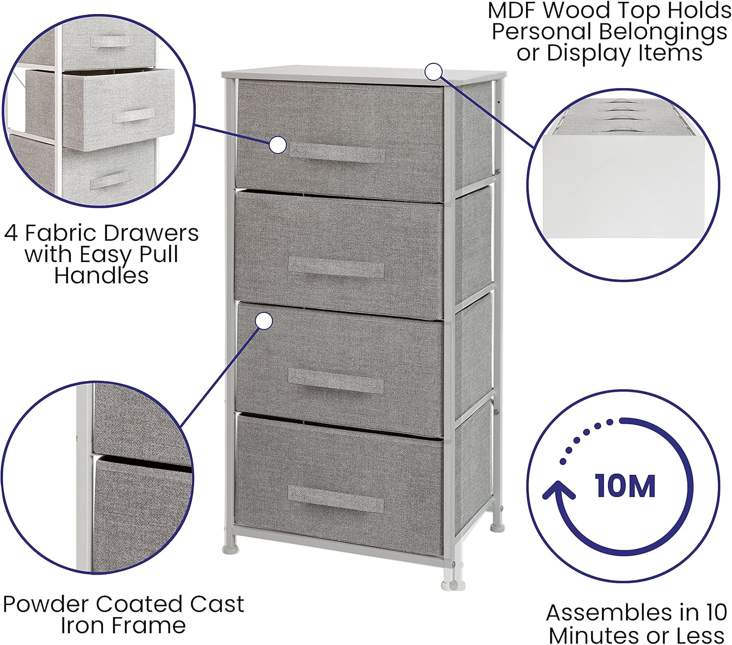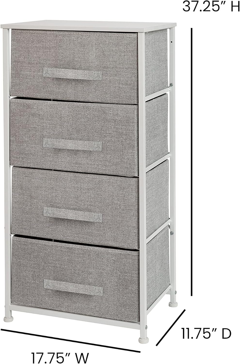 Store New Arrivals Add to Favorite View Feedback Contact Harris 4-Drawer Storage Chest of Drawers, Modern Bedroom Dresser with 4 Easy Pull Fabric Drawers and Engineered Wood Top, Light Gray Description Item model number WX-5L203-X-WH-GR-GG Warranty Description 1 year limited. Maximum recommended load 40 Pounds Country of Origin China Warranty Type 1 Year Limited Number of Pieces 1 Room Type Bedroom;Hallway;Home Office/Study Assembly Required Yes Batteries required No Special Feature Lightweight Product Dimensions 11.75"D x 17.75"W x 37.25"H Fabric Type 100% Polypropylene Fiber Perfume Unscented Item Weight 13.4 pounds Number of Drawers 4 Style Modern Target Audience Adult Mounting Type Floor Mount Color White/Gray Furniture Finish Metal Global Trade Identification Number 00889142993544 Product Care Instructions DC-Damp cloth Finish types Gray Drawers/White Frame Included Components Storage Drawer Units Material Engineered Wood, Polypropylene, Cast Iron Finish Type Gray Drawers/White Frame Size 11.8"D x 17.8"W x 37.3"H (4 Drawers) 100% Polypropylene Fiber MODERN 4-DRAWER STORAGE DRESSER: Brings seamless storage and organization to any bedroom, mudroom, walk-in closet, nursery, living room, or entryway EASY PULL NON-WOVEN FABRIC DRAWERS: Boasts 4 easy pull light gray non-woven fabric drawers that are fade and stain-resistant to bring modern style to any space VERSATILE STORAGE: Provides endless storage opportunities for clothes, accessories, household supplies, books, and a variety of other storage items DURABLE ENGINEERED WOOD TOP: Constructed with a durable engineered wood top that supports up to 40 lbs. of static weight, offering a convenient display area for small lamps, electronics, picture frames, and other décor EFFICIENT SIZE: Measures 17.75"W x 11.75"D x 37.25"H with four 15.875"W x 11"D x 8.5"W drawers to fit neatly in any bedroom while providing plenty of storage space Add stylish storage and organization to your bedroom with the Flash Furniture Harris 4-Drawer Storage Chest. This 4-drawer vertical organizer brings seamless storage and organization to any bedroom, mudroom, walk-in closet, nursery, living room, or entryway. Boasting four easy pull light gray non-woven fabric drawers that are fade and stain-resistant, this dresser chest brings modern style to any space while providing endless storage opportunities for clothes, accessories, household supplies, books, and other storage items. It's constructed with a durable engineered wood top that supports up to 40 pounds of static weight, offering a convenient display area for small lamps, electronics, picture frames, and other decor. The rust-resistant cast iron frame with long-lasting metal screws withstands years of quality organization, and the adjustable plastic floor glides provide a stable, level surface while protecting hard flooring surfaces. This dresser chest of drawers measures 17.75"W x 11.75"D x 37.25"H with four 15.875"W x 11"D x 8.5"W drawers to fit neatly in any bedroom while providing plenty of storage space. ABOUT US We’re dedicated to bringing you great deals on quality products. From home décor and garden essentials to tools, hardware, and pet accessories, our store has something for everyone — all at prices you’ll love. SHIPPING We ship all orders directly from the USA for fast, reliable delivery. Most items ship within 1 business day and include free shipping to the lower 48 states. For international orders, we use eBay’s Global Shipping Program — simply continue checkout to see costs, duties, and taxes for your country. FREE RETURNS We offer a 30-Day Return Policy on items which you are not completely satisfied with. You have the option for a full-refund or an exchange of the item. CUSTOMER SATISFACTION We do everything we can to ensure every customer is 100% satisfied. If something isn’t right, just send us a message — we’ll make it right quickly!