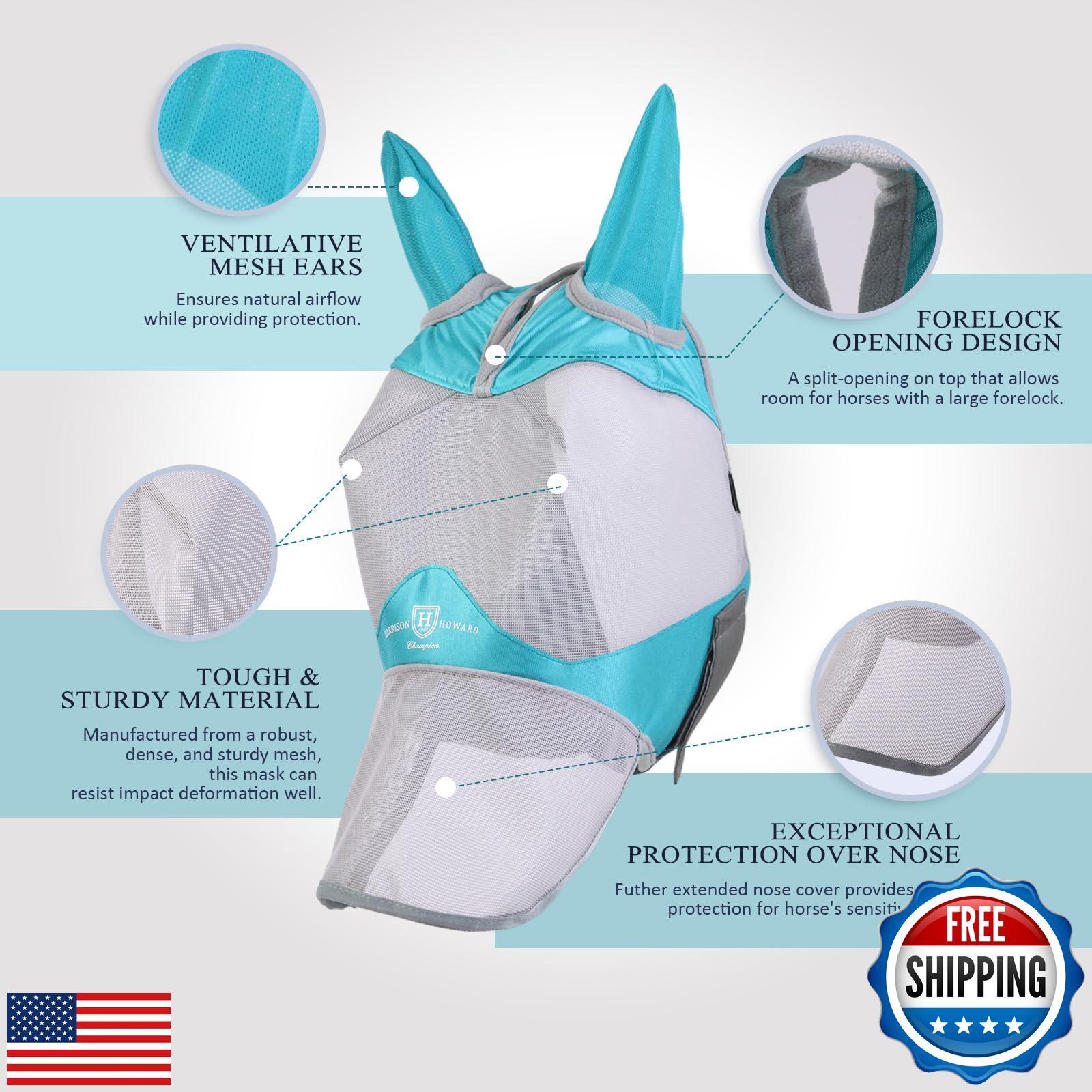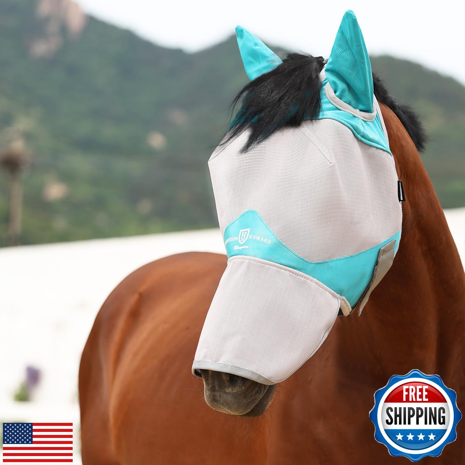 Harrison Howard Full Face Horse Fly Mask UV Protection and Breathable for Equine Use Comfortable Mint S Features RELIABLE UV PROTECTION: Dense and yet breathable, durable enough to protect your horse from harsh UV rays, avoids causing infections and skin conditions, meanwhile providing noticeable shading and cooling from light and sunshine. GREAT AIRFLOW: The mesh is dense and yet its micro-panel weave structure allows great airflow in the hear of summer, so that your horse can stay shaded and protected at the same time. TOUGH & STURDY MATERIAL: Manufactured from a robust, dense, and sturdy mesh, this mask has very good tensile strength and thus it can resist impact deformation well. FORELOCK OPENING DESIGN: A split-opening on top that allows room for horses with a large forelock. With the extra hair pulled out of the hole, the mask will lay comfortably and flat on the horse’s head. SECURE FIT OVER THE BRIDLE: Easily and quickly attaches over the bridle. One adjustable touch-and-go tape under the jaw ensures a safe closure for a proper fit while allowing the mask to stay in place. Shipping Free & Fast Shipping: We offer free shipping to most of the USA with a normal delivery time of 3-7 days. However, due to the current situation, additional delivery time (up to 3 weeks) may be required for some items. Alternative Carriers: We may use alternative carriers (e.g., USPS, FedEx, UPS) to ensure your package arrives safely and on time. Due to the use of multiple carriers, we are unable to provide a tracking number automatically. Handling Time: Orders are processed and shipped within 1-2 business days of receiving cleared payment. Shipping Restrictions: Shipping to Alaska, Hawaii, Puerto Rico, Guam, and other US territories may incur shipping charges or delivery restrictions. Please contact us before ordering, or your order can be refunded/cancelled. State Restrictions: Certain items may not be shipped to California due to state regulations. Contact for Tracking Updates: If you require tracking updates or have any concerns about the delivery of your order, please feel free to contact us, and we will be happy to assist you. Return Policy 30-Day Hassle-Free Returns: If you are not completely satisfied with your purchase, you can return the item for free within 30 days of receiving it for a full refund or exchange. Easy Return Process: Contact us, and we will provide you with a prepaid return shipping label and detailed instructions. No Restocking Fee: There are no restocking fees for returns. However, the buyer is responsible for return shipping costs if the return is not due to a seller's error. Refund Processing: Refunds will be processed within 1 business day of receiving the returned item in its original condition. Payment We accept all major credit cards, PayPal, and Apple Pay for your convenience. Your payment information is secure and encrypted to ensure a safe and seamless transaction. Please complete your payment within 3 days of purchase to avoid any delays in shipping. Feedback Your feedback is extremely important to us. We strive to provide the best products and customer service possible. If you are satisfied with your purchase, please take a moment to leave us a positive review. If you have any concerns or issues with your order, please contact us before leaving negative feedback. We are committed to resolving any problems and ensuring your satisfaction. Contact Us If you have any questions or concerns, please feel free to reach out to our customer support team. You can contact us through the eBay messaging system. We are available Monday to Friday, 9:00 am to 5:00 pm EST, and we will do our best to respond to your inquiry within 24 hours. Thank you for supporting our small family business!