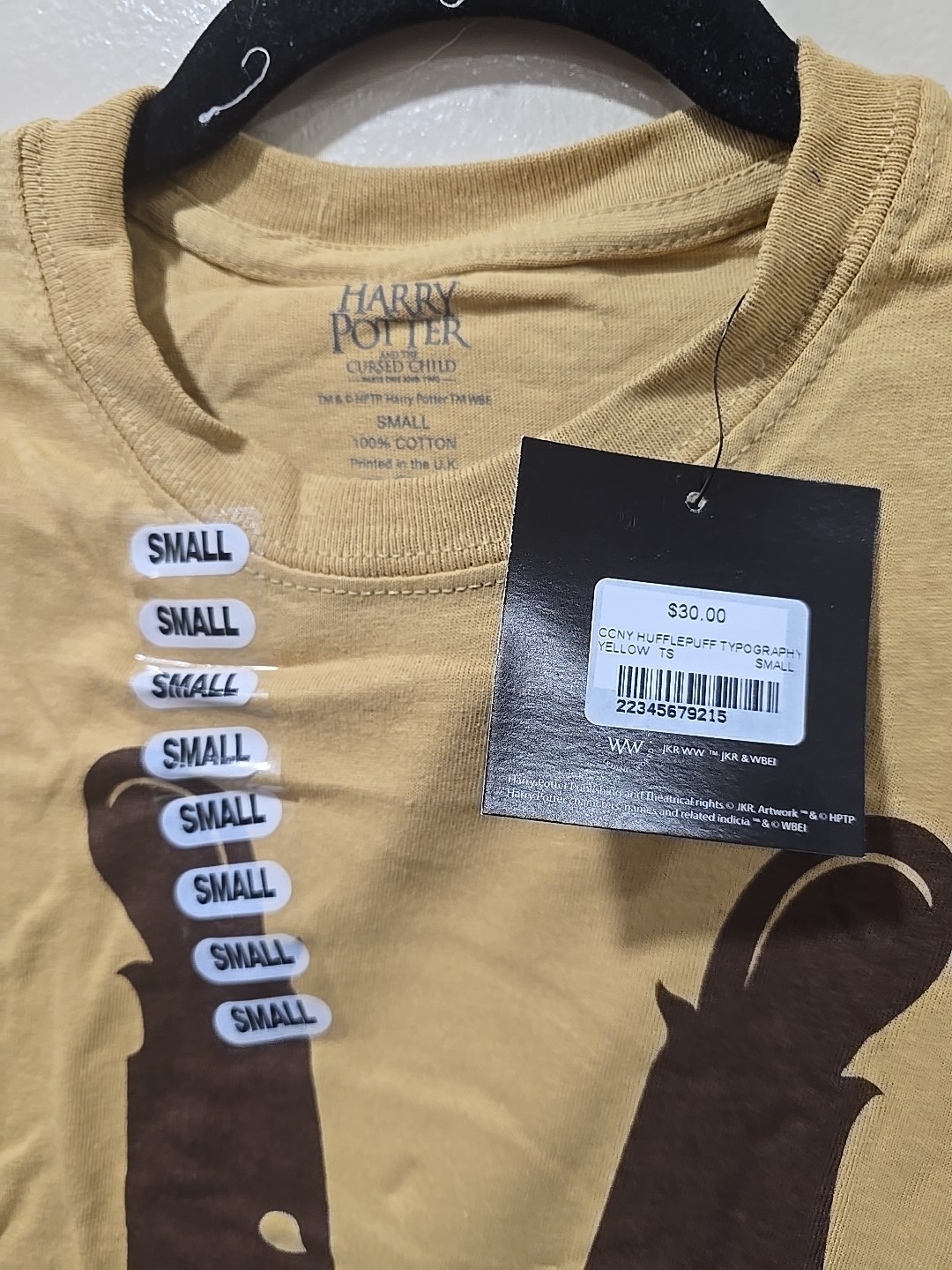 This Harry Potter and the Cursed Child Hufflepuff Logo T-Shirt in adult sizes S & M features the iconic Hufflepuff design in gold and brown colors. Made of a comfortable polyester and cotton blend, this short sleeve shirt with a crew neck is machine washable for easy care. The shirt is accented with the official Harry Potter logo, making it a must-have for fans of the series. Perfect for both men and women, this regular fit t-shirt is a stylish and versatile addition to any fan's wardrobe.