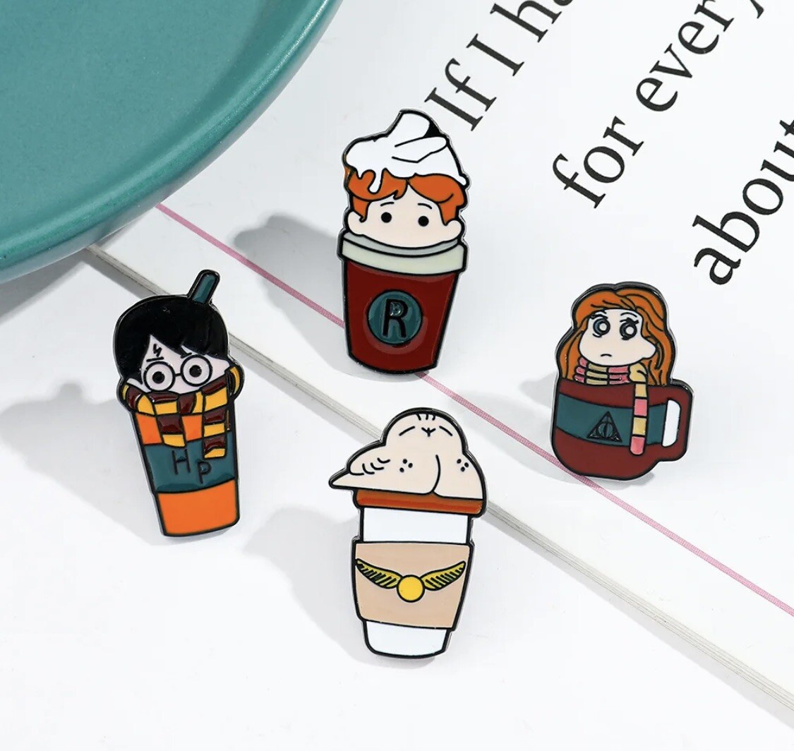 An adorable set of 4 enamel pins with a Harry Potter and Coffee Theme. It would be a great addition to anyone’s collection. Super cute to pin on your bags, backpacks, planner pouches, cosmetic bags and so much more! Pins measure about 1” each Thanks for looking!