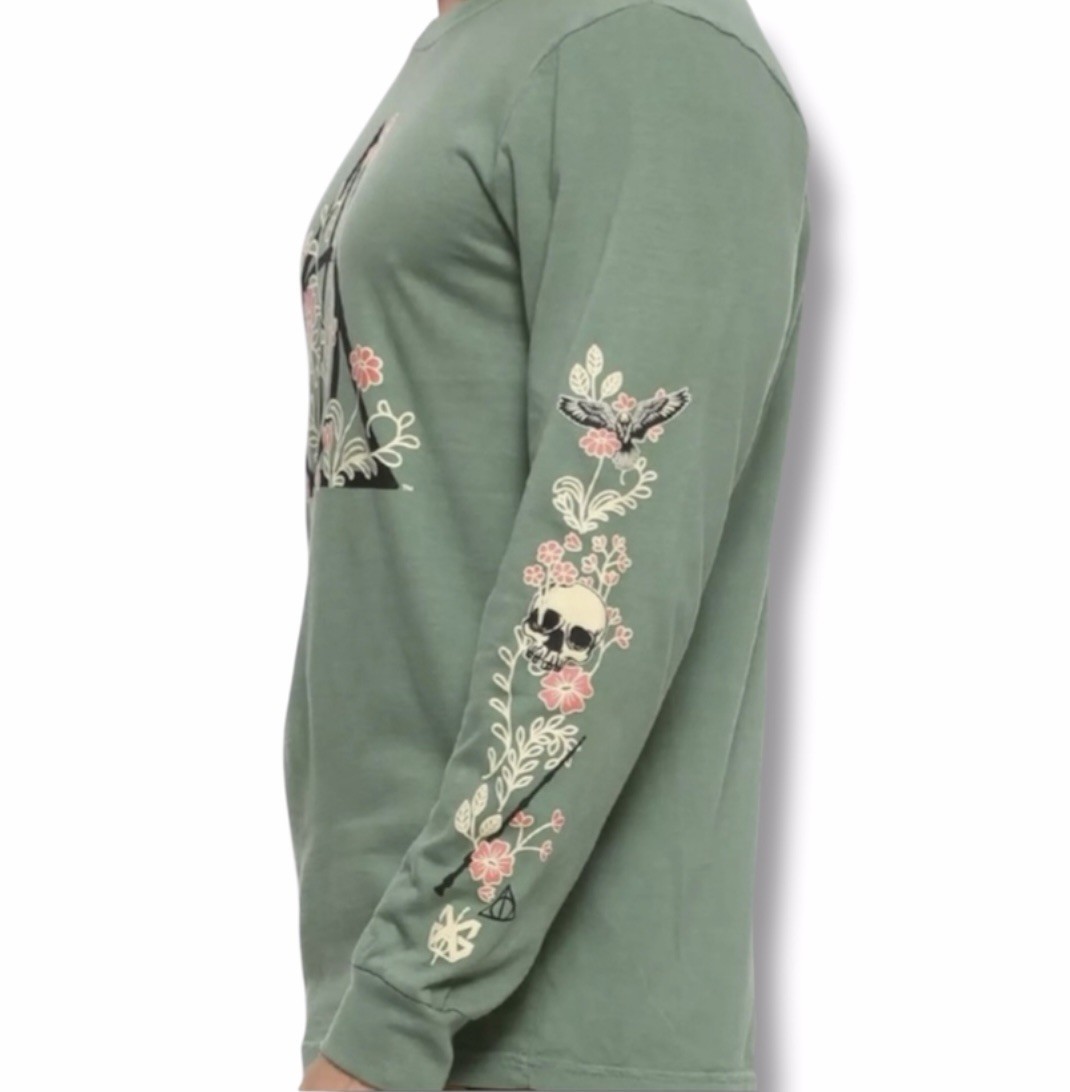 Brand: BoxLunch Item: Harry Potter Deathly Hallows long sleeve shirt Size: US Mens Medium Color: Green; Multi Condition: Preowned great, no flaws Material: 100% cotton *all sales final