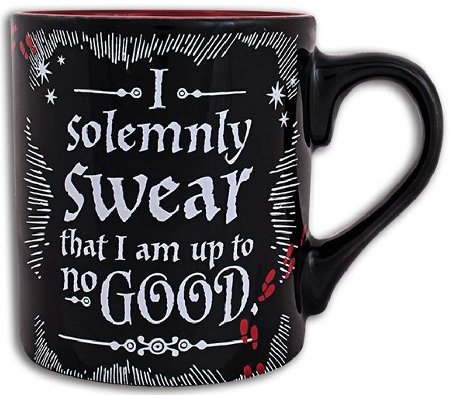 Fans and collectors of Harry Potter™ memorabilia will adore this ceramic coffee mug! The sturdy mug is made of red and black ceramic and features the famous Harry Potter phrase I solemnly swear that I am up to no GOOD . Holds up to 14 ounces of your favorite beverage. Safe for use in microwave and dishwasher. Makes a great gift for Wizards and Potter fanatics of all ages! Each mug holds 14 ounces of liquid and measures 4 inches tall Sold in increments of 4 mugs Material: ceramic Dishwasher and microwave safe Features easy grip handle Licensed product