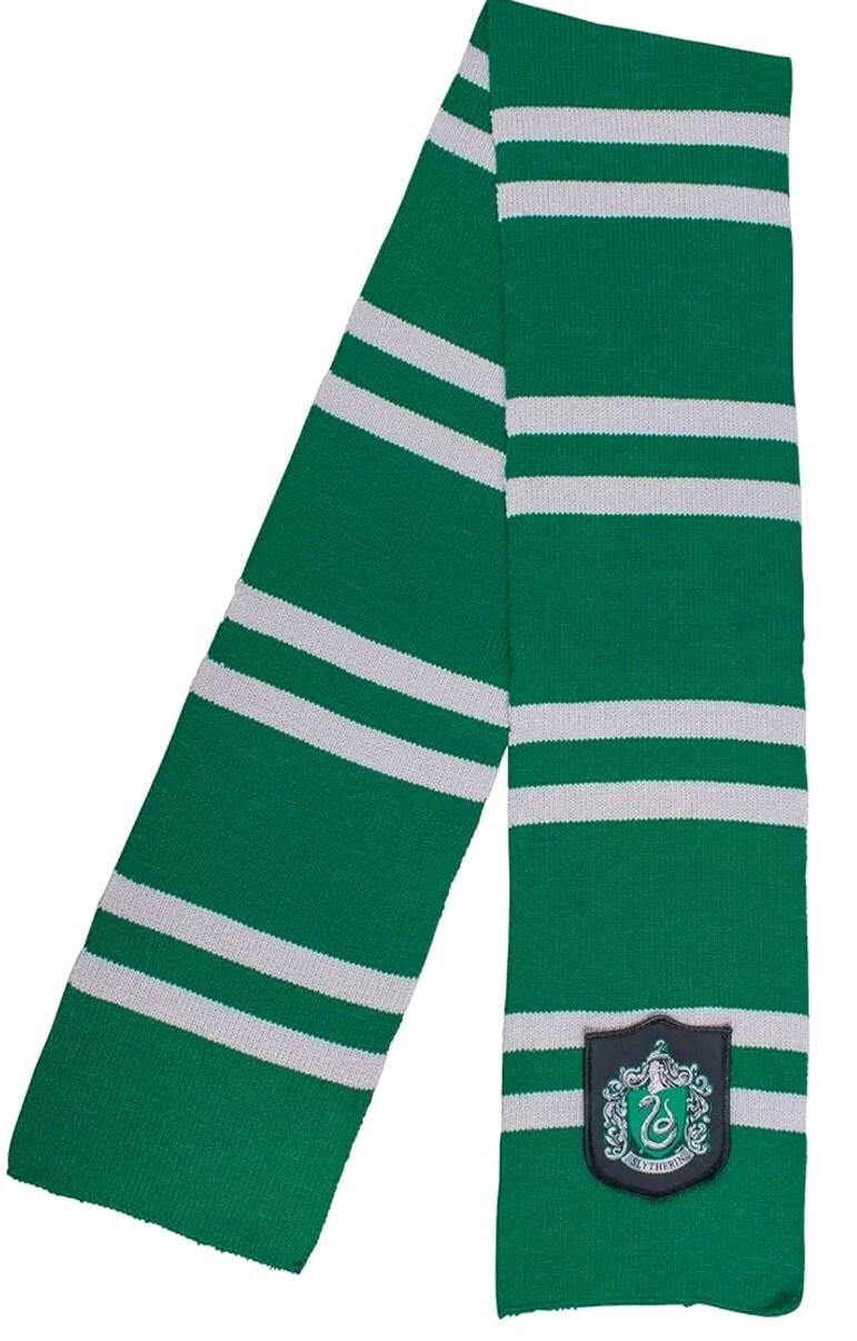 The product is a Harry Potter Slytherin House cosplay knit costume scarf wrap, designed for fans of the fantasy franchise. It features a Vogue style inspired by the iconic Slytherin House from the Harry Potter series, perfect for adding a touch of magic to any cosplay or costume ensemble. Made from high-quality materials and with attention to detail, this scarf wrap allows fans to embody the essence of the Slytherin House while staying true to the fantasy world of Harry Potter. QUALITY HARRY POTTER SCARF - Adult-sized knit Slytherin costume scarf that you can wear to a party as well as on a crisp evening out SHOW YOUR SLYTHERIN PRIDE - Features a Slytherin patch prominently on house colors to tell others where you got your wizarding skills ACCESSORIZE OR COMPLETE YOUR OUTFIT - Authentic, licensed Slytherin scarf inspired by the Harry Potter movies HARRY POTTER SLYTHERIN WINTER WEAR - Great way to accessorize your Draco Malfoy and Professor Snape costumes QUALITY COSTUMES FOR HAPPY PEOPLE - To keep this Slytherin scarf well maintained, it is recommended that it be spot cleaned. Includes one 60 x 7 inch adult sized scarf.