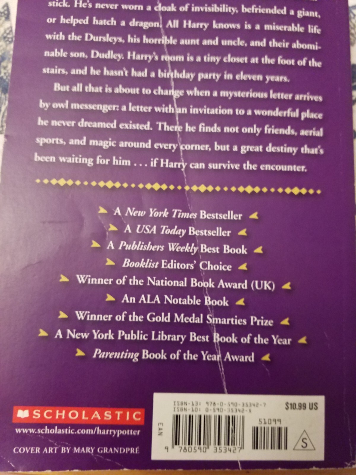 Immerse yourself in the world of Harry Potter with this captivating first book of the series, "Harry Potter and the Sorcerer's Stone" by J.K. Rowling. This mass market format book published by Scholastic, Incorporated, has 320 pages filled with action, adventure, and magic. The book measures 7.6 inches in length, 5.2 inches in width, and 0.9 inches in height, and weighs 7.5 ounces. It is written in English and illustrated by Mary Grandpré. This book is perfect for fans of fantasy and magic, school and education, and family and orphans and foster homes.