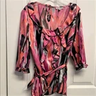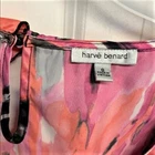 This Harve Bernard blouse is perfect for any occasion from work to party or casual wear. The boat neck and mid-sleeves give it a classic look while the ruffle and bow accents add a touch of fun. Made of high-quality satin fabric, the colorful design is perfect for summer, fall, or spring. The top comes in size S, with a belted feature that accentuates the waistline. The blouse is easy to wear, with a pullover closure, and requires hand washing only for garment care. The blouse is designed with a colorblock pattern and is ideal for those who love bohemian, punk, or hippie themes. This is a wardrobe staple for any fashion-forward woman. Some fabric distortion on sleeves other than that good preowned Condition 100% shiny satin polyester hand wash 15’ across shoulders 15.50’ long sleeves Ruffle cuff 18.50’ across chest 42’ around bottom 25’ long from collar seams to bottom front removable belt buttons in the back