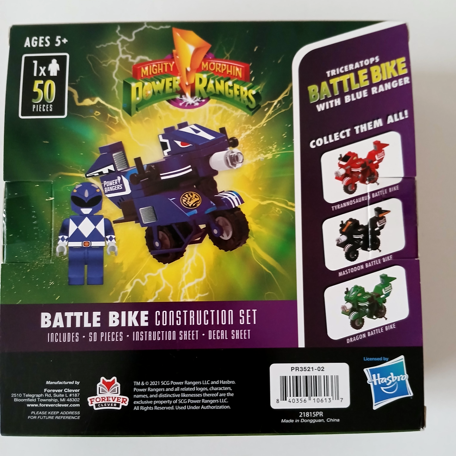 Rev up your imagination with this Hasbro Mighty Morphin Power Rangers Battle Bike 50 PC Construction Set in blue. The set features a Triceratops battle bike and the Blue Ranger character. It's an original, unassembled kit that comes in its original packaging, perfect for fans of the Mighty Morphin Power Rangers TV show and franchise.
