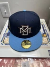 This is a 7 5/8 navy New Era Milwaukee Brewers fitted baseball cap, part of the Hat Club Exclusive Beer Pack featuring Blue Moon beer. The hat showcases a collaboration between Hat Club and the Milwaukee Brewers, perfect for fans of the team and beer enthusiasts alike. It is a stylish and unique accessory that combines elements of sports and beverages, making it a must-have for collectors and fans of exclusive collaborations.