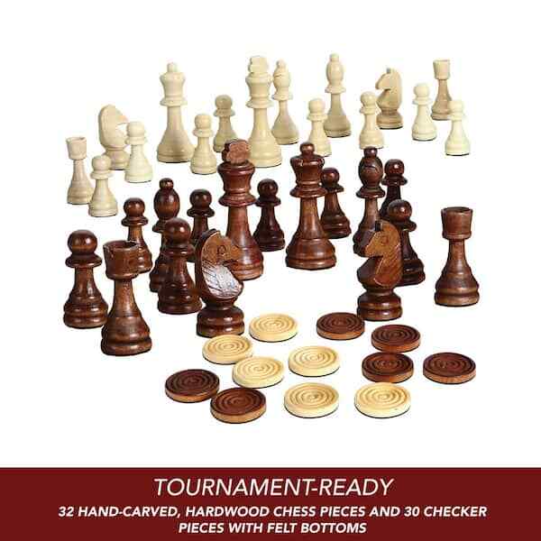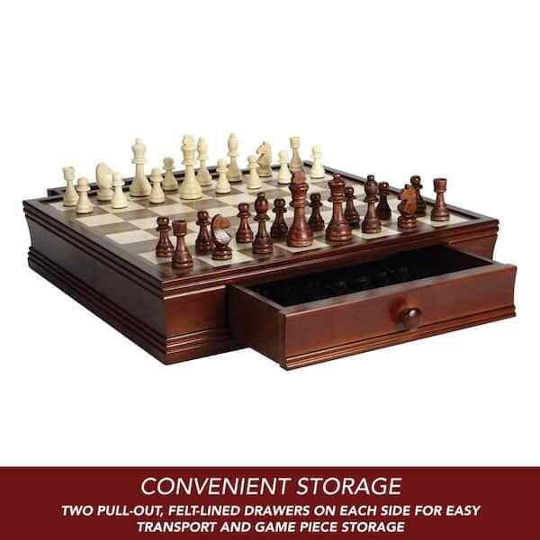 The Prodigy Wood Chess and Checkers Set is hand crafted from solid hardwood and hardwood veneers, featuring a beautiful walnut and maple top. The classic styling of the square chess and checkerboard pattern pair evenly with the intricately detailed hardwood game pieces with felt-lined bottoms. Two pull-out, felt-lined drawers on each side of the Prodigy provide easy transport and game-piece storage when not in use. The rich walnut furniture-grade cabinet finish adds the final touches to this dynamic high-quality show piece. 90-day limited warranty.