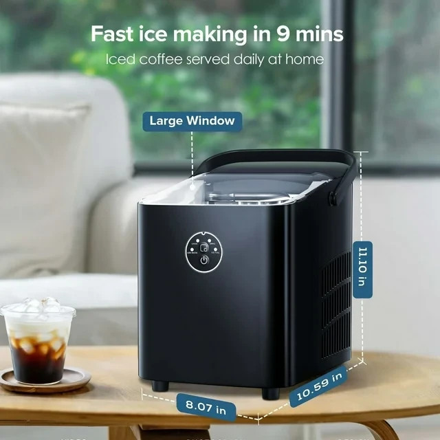 Product details Havato Tabletop Ice Maker: your ultimate solution for fresh, ready-to-use ice wherever you need it! High Efficiency: produce up to 26 lbs of bullet-shaped ice cubes in just 24 hours! Self-Cleaning Program: ensures every cube is fresh and healthy with no extra effort. Easy One-Click Operation: no complicated setup! Just press a button and relax while the machine works its magic. Transparent Lid Design: peek through the large visual cover to watch the ice-making process and adjust settings with ease. Low Noise: enjoy peace and quiet as it works silently in the background. Perfect for parties, drinks, and everyday use. Whether it’s your home, office, kitchen, or bar, this compact and stylish ice maker brings convenience and charm to any space. 【 Perfectly Compact Design 】 :This ice maker is sized at just 8.07 x 11.1 x 10.59 inches, fitting effortlessly on countertops, kitchen islands, or desks without consuming excessive space. It's the ideal addition to any space where you need ice, whether in a busy kitchen or a home office. 【 Efficient Ice Production 】 :Experience rapid ice - making! Bullet - shaped ice cubes are ready in a mere 9 minutes. Thanks to its powerful compressor, it can churn out up to 26 lbs of ice per day. The 1.0 L water tank ensures continuous operation, always keeping the machine primed and ready to produce ice whenever you need it. 【 Convenient and Portable 】 : Featuring a sturdy handle, this countertop ice maker is a breeze to carry around. The scoop neatly attaches to the ice basket for convenient storage. Move it from room to room or take it along to events with ease, making it a versatile ice - making solution for various occasions. 【 User - Friendly Control Panel 】 : The ice maker is equipped with a clear window at the top, allowing you to monitor the ice - making process at a glance. Indicator lights are built - in to notify you when the ice basket is full, prompting you to remove the ice, and when the water level is low, reminding you to refill. The smart control panel simplifies the process, enabling you to enjoy a cold, refreshing drink with just a few simple steps. 【 Cleaning Function 】 : Maintain the freshness and cleanliness of your ice with the automatic self - cleaning function. To activate, simply plug in the power, press and hold the power button for 3 seconds. The machine will then enter the cleaning mode, indicated by the four lights flashing alternately. Remember not to disconnect the power during cleaning. Once the cleaning cycle is complete, the machine automatically switches to standby mode, ready for its next use.